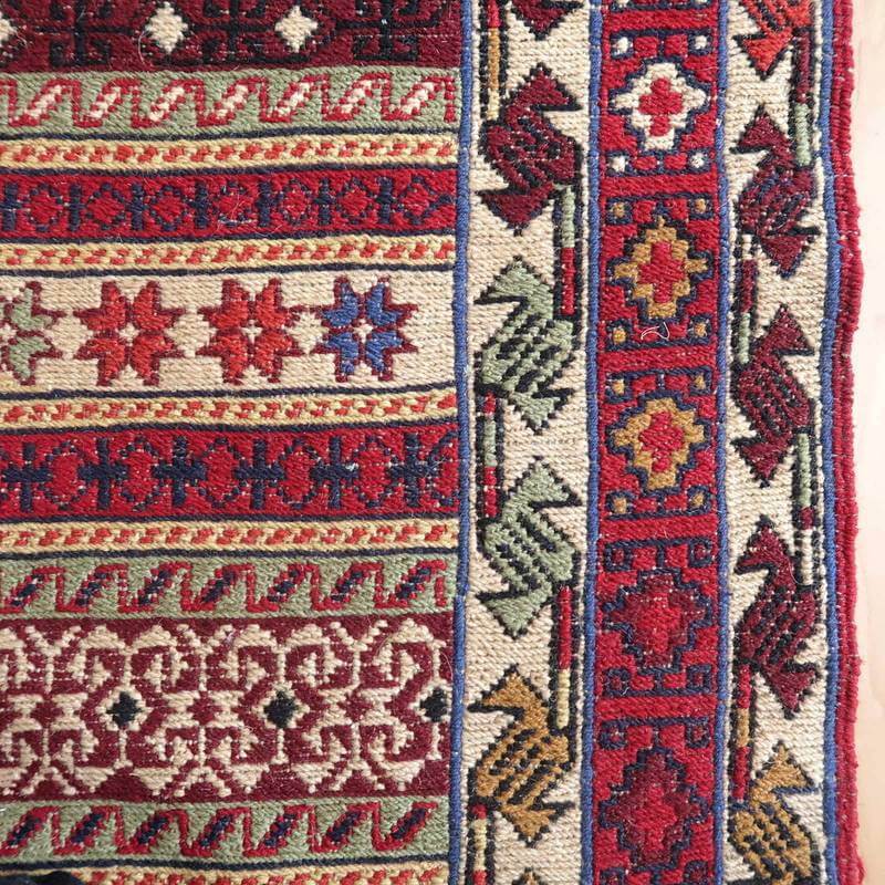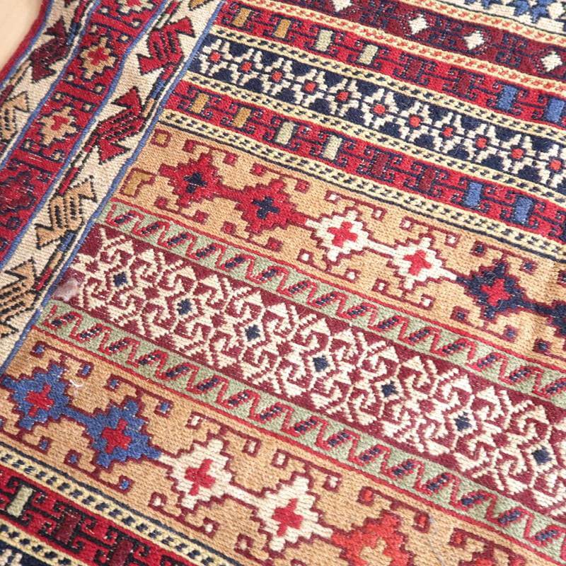 刺繍のように細かな文様が全面に施された美しいスマック織りのキリム。赤を基調に様々な色で文様が入った多色使いですが柄が細かいので落ち着きもあります。一目一目の模様をじっくり眺めて味わえるキリムでたいへん上質感があります。スマック織りは裏面に模様の糸を渡してあるので片面使いのキリムになります。