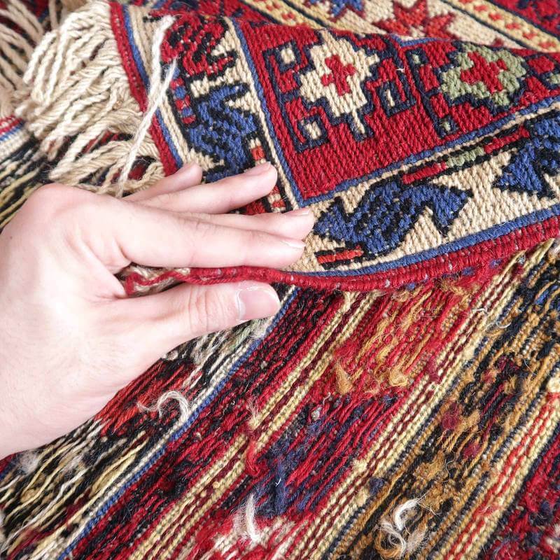 スマック織りとは、イランのキリムの織り方の技法です。生地は刺繍のような仕上がりですが、これは後から刺したものではなく、土台の縦糸と横糸の上にもう一本横糸を絡めるように巻き込んで織っていく高度なテクニックで、生地を二重に織るため通常の平織りのキリムより倍の手間ひまが掛かる分高価になりますが、非常に堅固で丈夫、また普通より細かなデザインを描けるという長所がありますので、価格以上の価値を感じて頂けるキリムです。