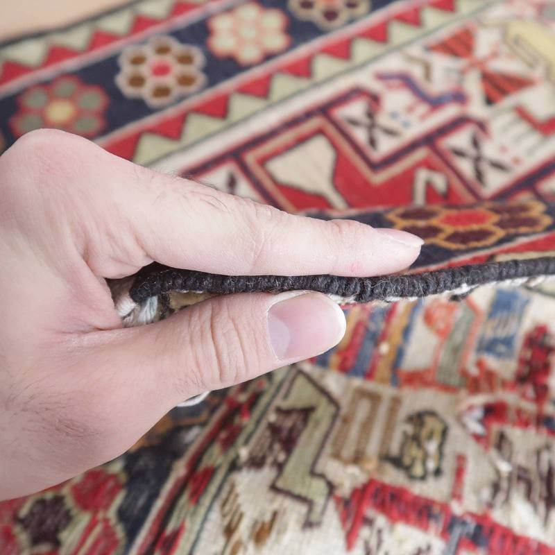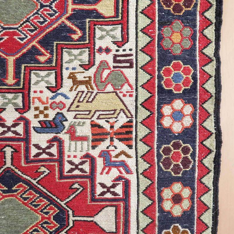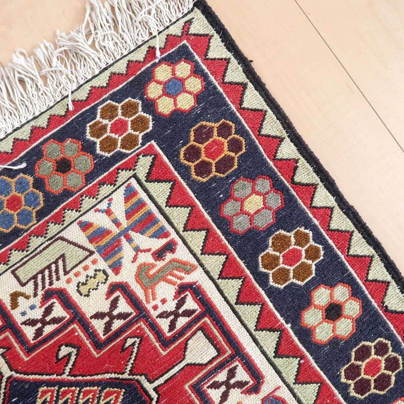 刺繍のように細かな文様が全面に施された美しいスマック織りのキリム。赤を基調に様々な色で文様が入った多色使いですが柄が細かいので落ち着きもあります。一目一目の模様をじっくり眺めて味わえるキリムでたいへん上質感があります。スマック織りは裏面に模様の糸を渡してあるので片面使いのキリムになります。