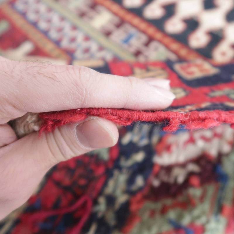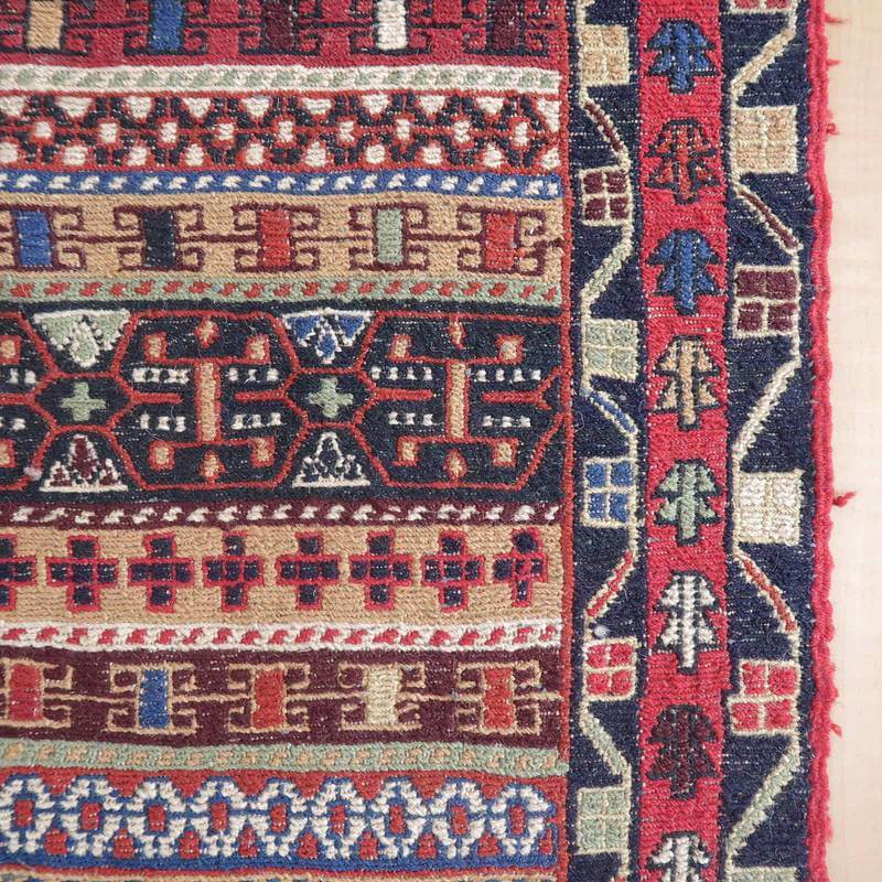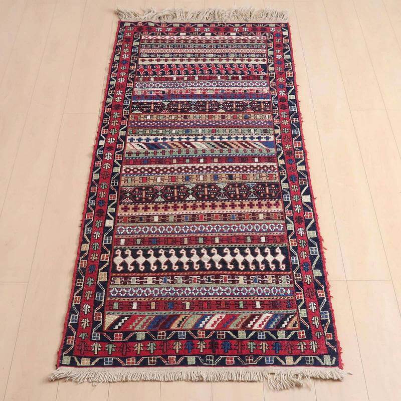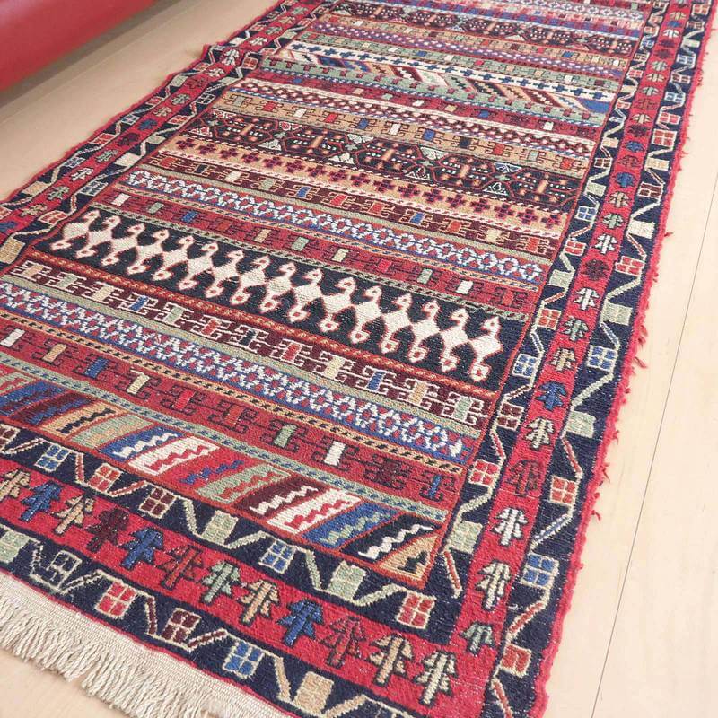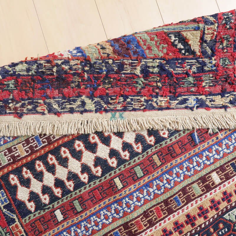 刺繍のように細かな文様が全面に施された美しいスマック織りのキリム。赤を基調に様々な色で文様が入った多色使いですが柄が細かいので落ち着きもあります。一目一目の模様をじっくり眺めて味わえるキリムでたいへん上質感があります。スマック織りは裏面に模様の糸を渡してあるので片面使いのキリムになります。