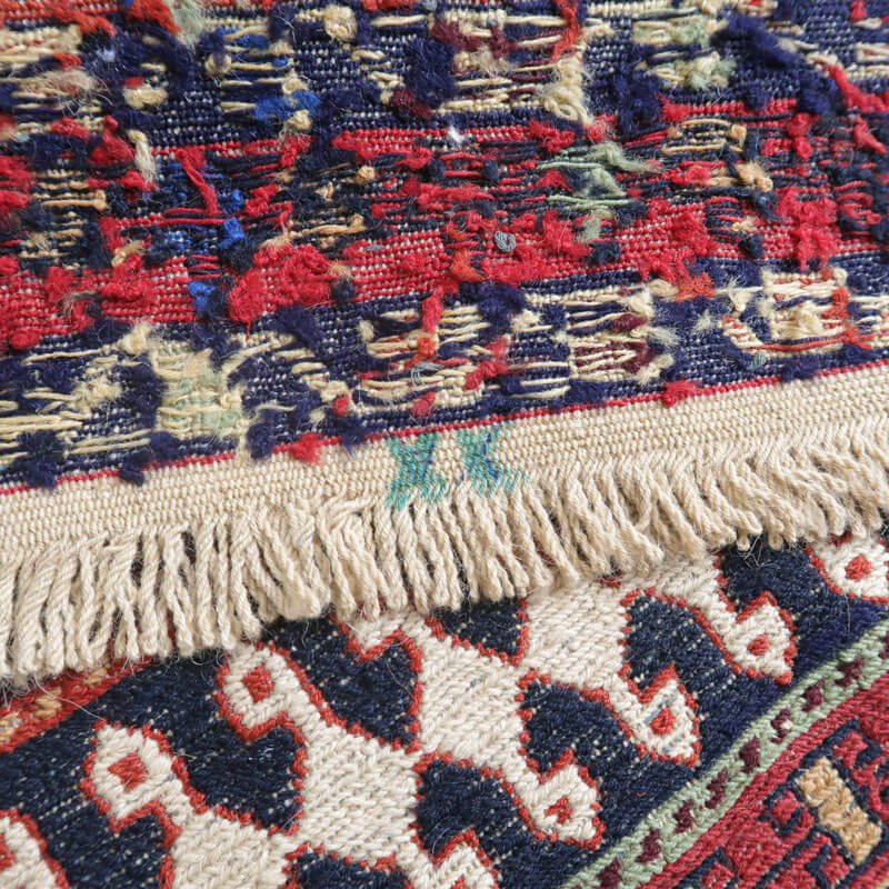 スマック織りとは、イランのキリムの織り方の技法です。生地は刺繍のような仕上がりですが、これは後から刺したものではなく、土台の縦糸と横糸の上にもう一本横糸を絡めるように巻き込んで織っていく高度なテクニックで、生地を二重に織るため通常の平織りのキリムより倍の手間ひまが掛かる分高価になりますが、非常に堅固で丈夫、また普通より細かなデザインを描けるという長所がありますので、価格以上の価値を感じて頂けるキリムです。