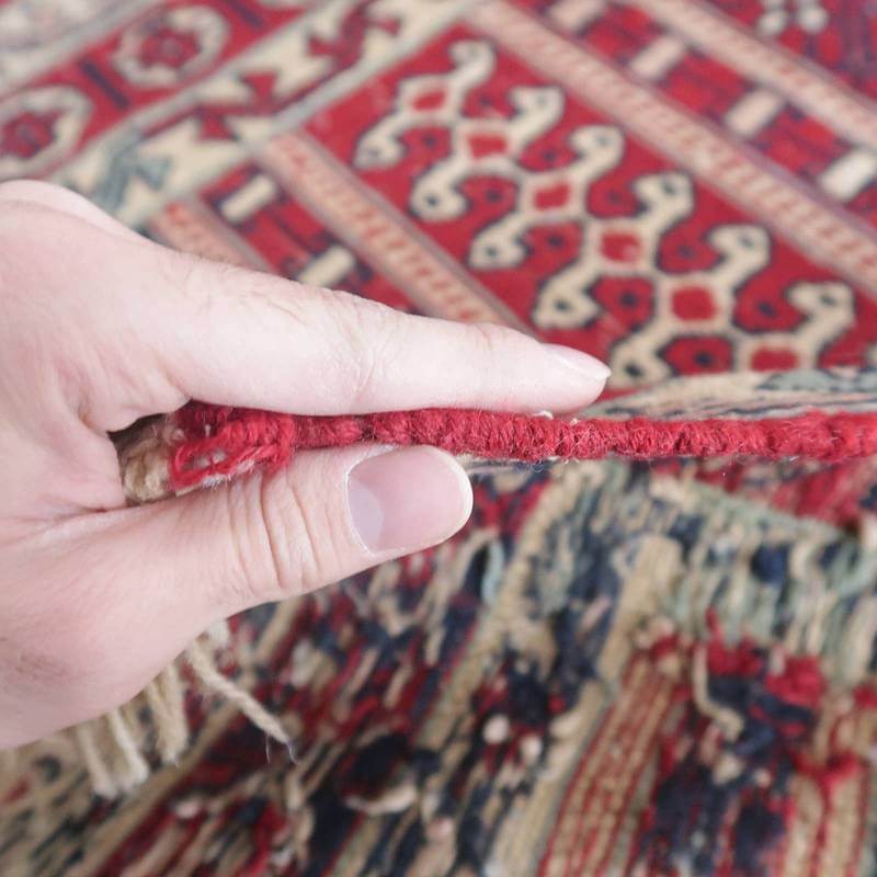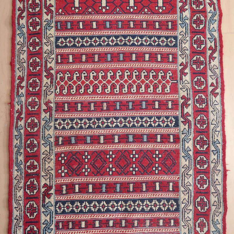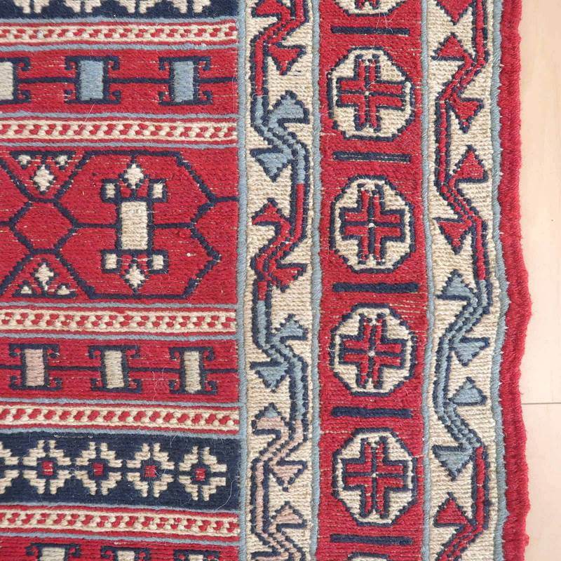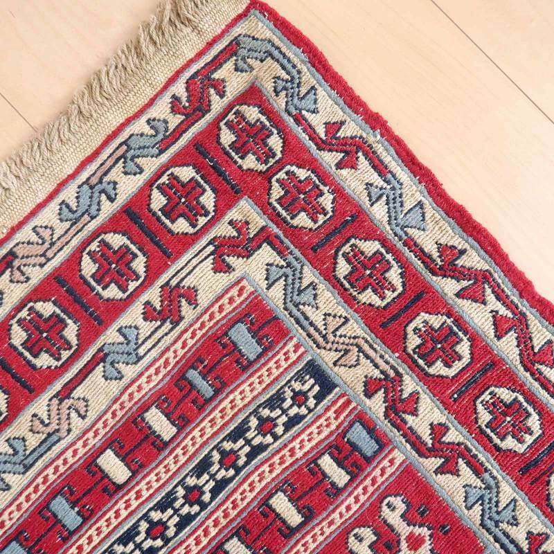 刺繍のように細かな文様が全面に施された美しいスマック織りのキリム。赤を基調に様々な色で文様が入った多色使いですが柄が細かいので落ち着きもあります。一目一目の模様をじっくり眺めて味わえるキリムでたいへん上質感があります。スマック織りは裏面に模様の糸を渡してあるので片面使いのキリムになります。