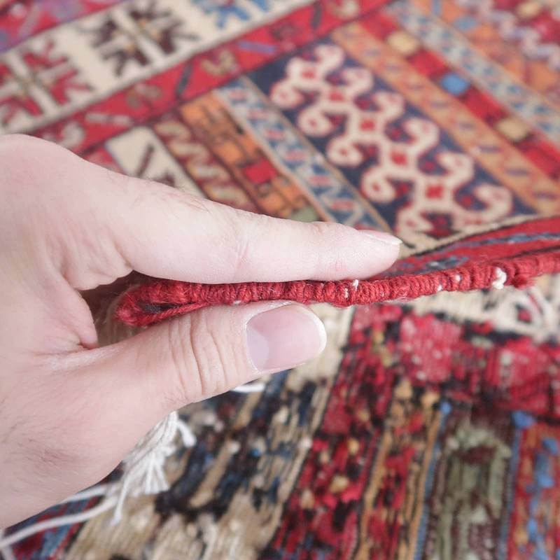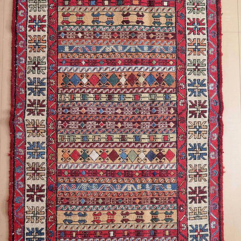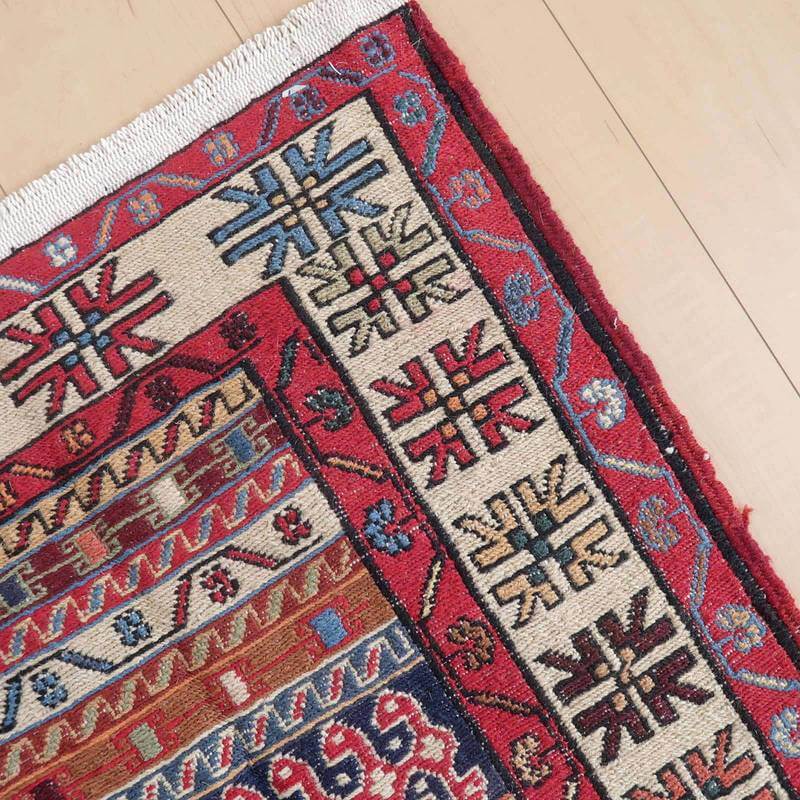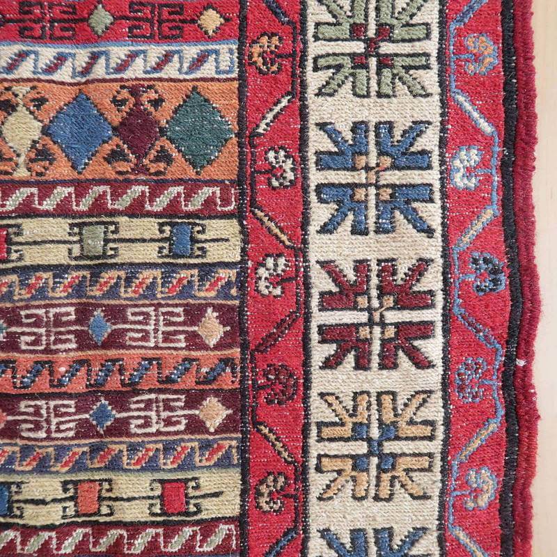 刺繍のように細かな文様が全面に施された美しいスマック織りのキリム。赤を基調に様々な色で文様が入った多色使いですが柄が細かいので落ち着きもあります。一目一目の模様をじっくり眺めて味わえるキリムでたいへん上質感があります。スマック織りは裏面に模様の糸を渡してあるので片面使いのキリムになります。