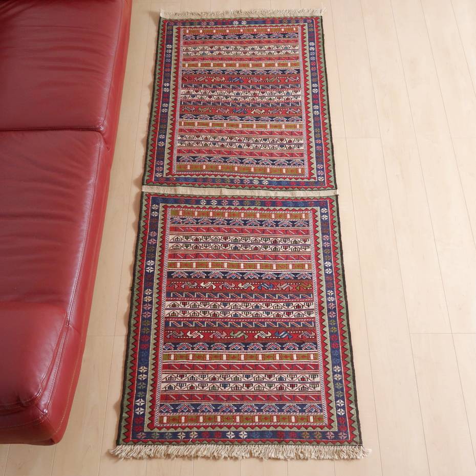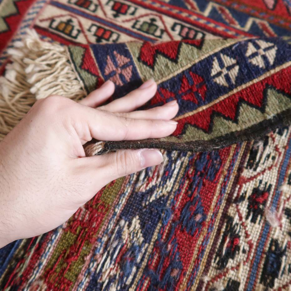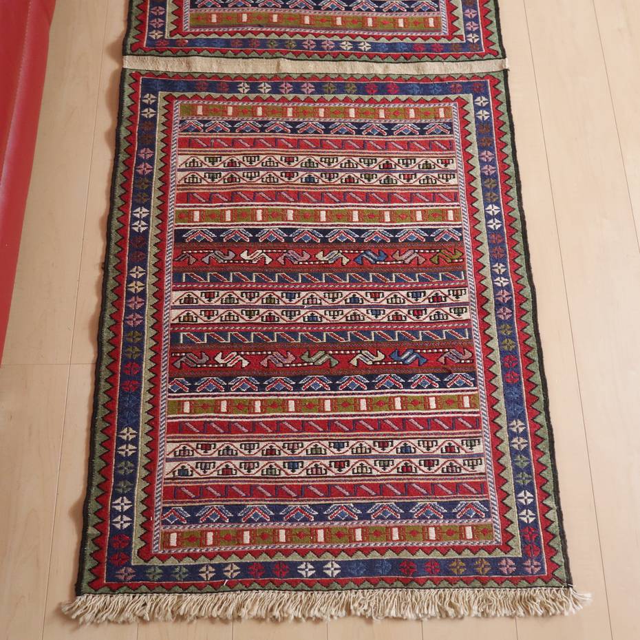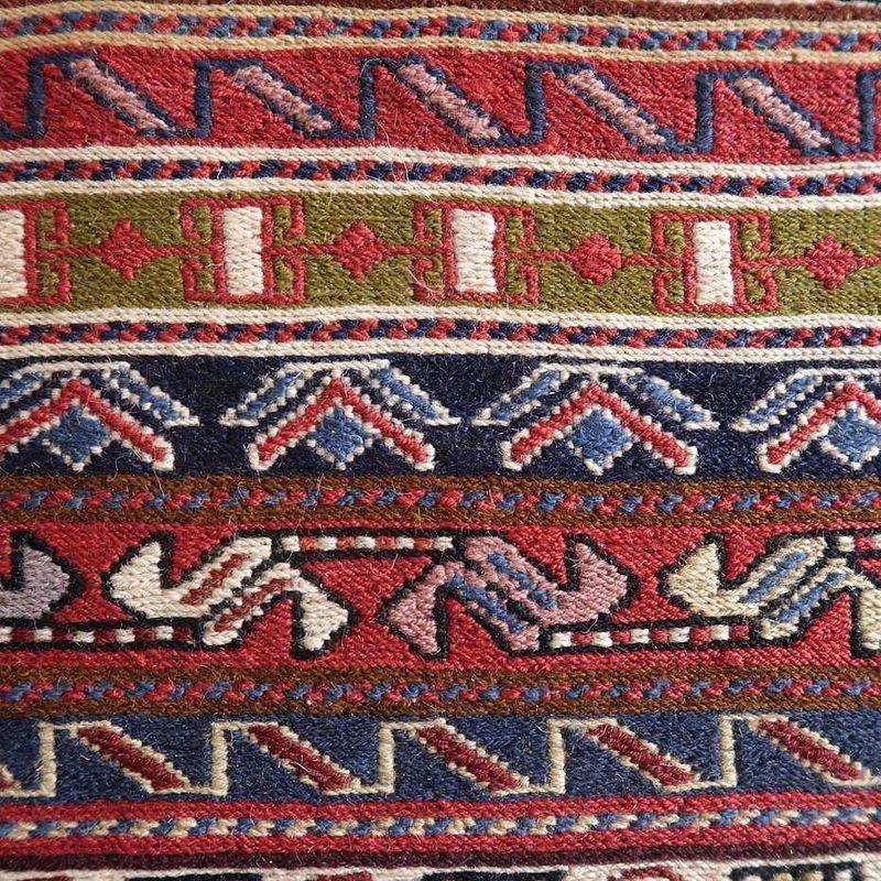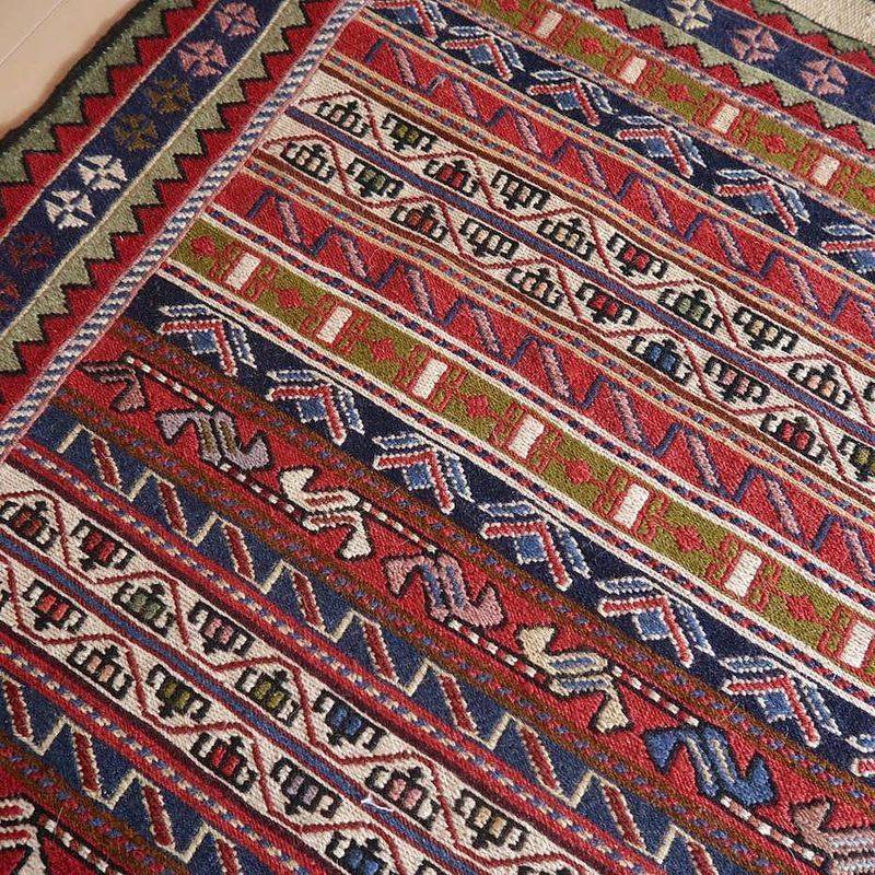 スマック織りとは、イランのキリムの織り方の技法です。生地は刺繍のような仕上がりですが、これは後から刺したものではなく、土台の縦糸と横糸の上にもう一本横糸を絡めるように巻き込んで織っていく高度なテクニックで、生地を二重に織るため通常の平織りのキリムより倍の手間ひまが掛かる分高価になりますが、非常に堅固で丈夫、また普通より細かなデザインを描けるという長所がありますので、価格以上の価値を感じて頂けるキリムです。