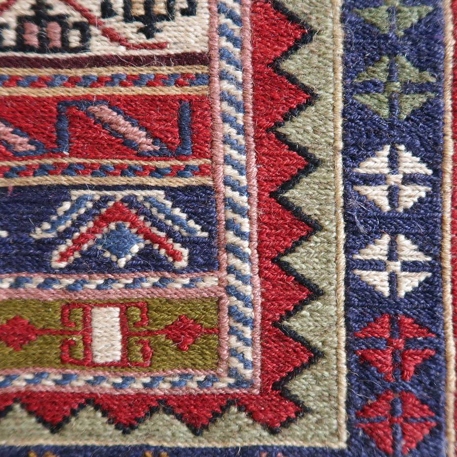 刺繍のように細かな文様が全面に施された美しいスマック織りのキリム。赤を基調に薄ベージュの部分は茶渋がかったような渋みがあって多色使いながら落ち着きもあります。一目一目の模様をじっくり眺めて味わえるキリムでたいへん上質感があります。スマック織りは裏面に模様の糸を渡してあるので片面使いのキリムになります。