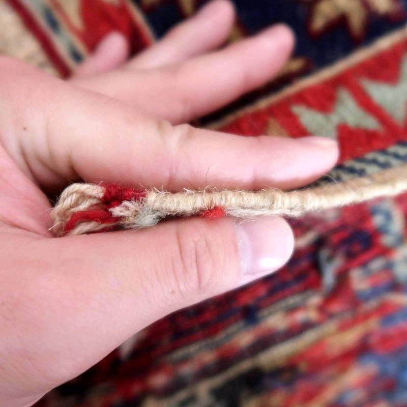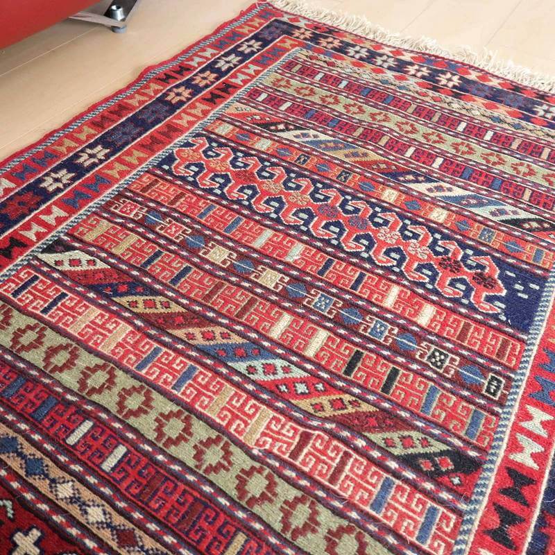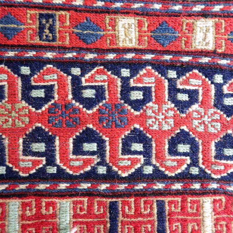 刺繍のように細かな文様が全面に施された美しいスマック織りのキリム。赤を基調に様々な色で文様が入った多色使いですが柄が細かいので落ち着きもあります。一目一目の模様をじっくり眺めて味わえるキリムでたいへん上質感があります。スマック織りは裏面に模様の糸を渡してあるので片面使いのキリムになります。スマック織りとは、イランのキリムの織り方の技法です。生地は刺繍のような仕上がりですが、これは後から刺したものではなく、土台の縦糸と横糸の上にもう一本横糸を絡めるように巻き込んで織っていく高度なテクニックで、生地を二重に織るため通常の平織りのキリムより倍の手間ひまが掛かる分高価になりますが、非常に堅固で丈夫、また普通より細かなデザインを描けるという長所がありますので、価格以上の価値を感じて頂けるキリムです。