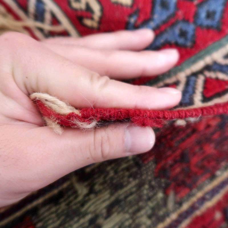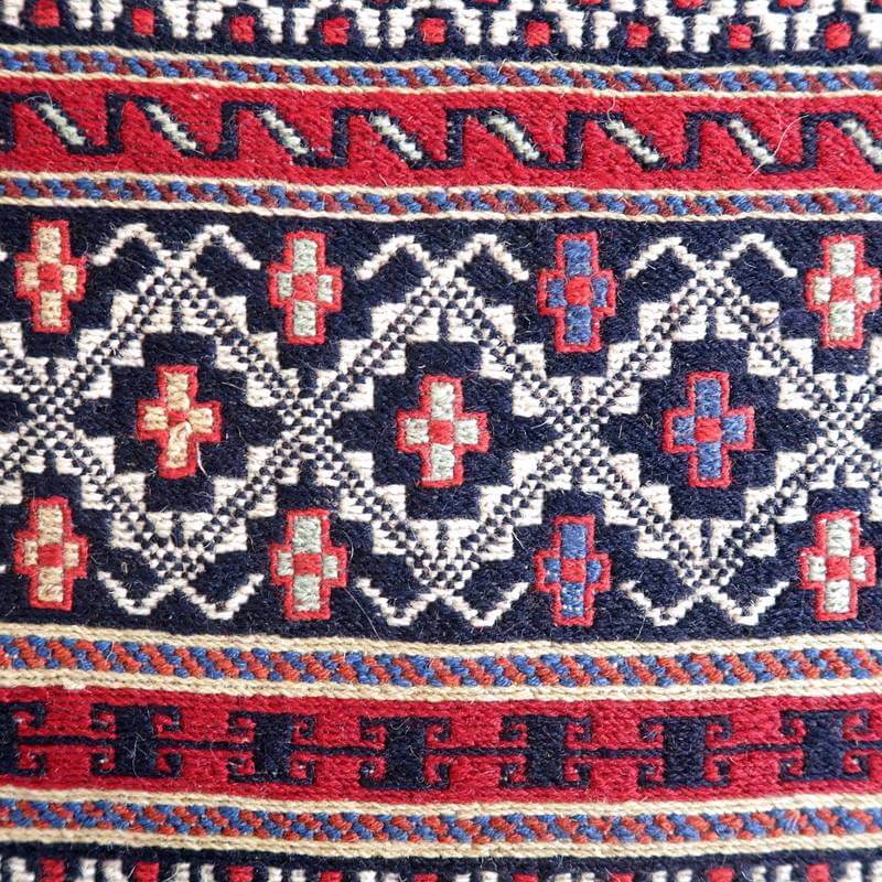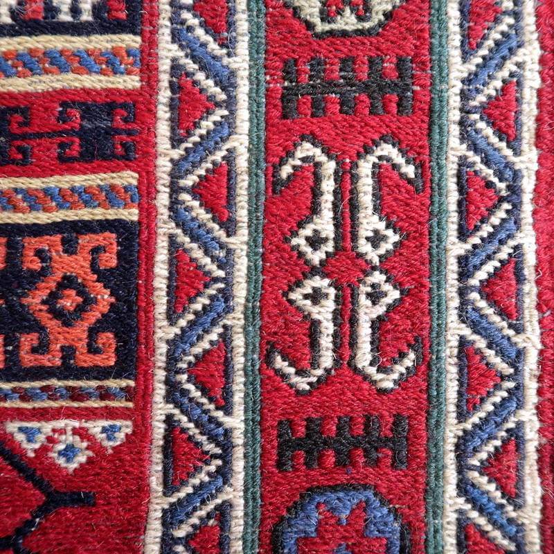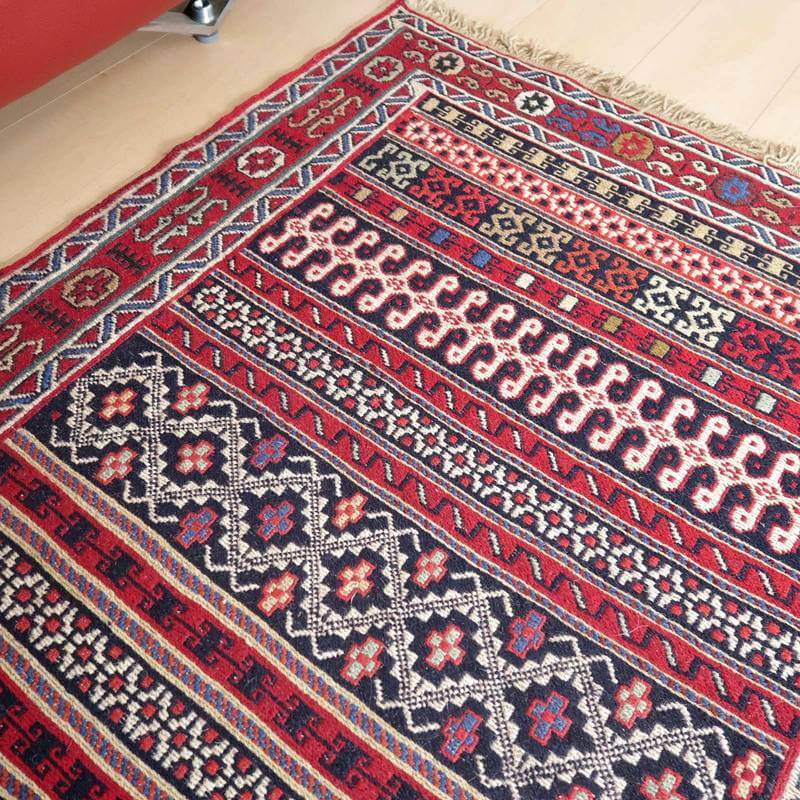刺繍のように細かな文様が全面に施された美しいスマック織りのキリム。赤を基調に様々な色で文様が入った多色使いですが柄が細かいので落ち着きもあります。一目一目の模様をじっくり眺めて味わえるキリムでたいへん上質感があります。スマック織りは裏面に模様の糸を渡してあるので片面使いのキリムになります。スマック織りとは、イランのキリムの織り方の技法です。生地は刺繍のような仕上がりですが、これは後から刺したものではなく、土台の縦糸と横糸の上にもう一本横糸を絡めるように巻き込んで織っていく高度なテクニックで、生地を二重に織るため通常の平織りのキリムより倍の手間ひまが掛かる分高価になりますが、非常に堅固で丈夫、また普通より細かなデザインを描けるという長所がありますので、価格以上の価値を感じて頂けるキリムです。