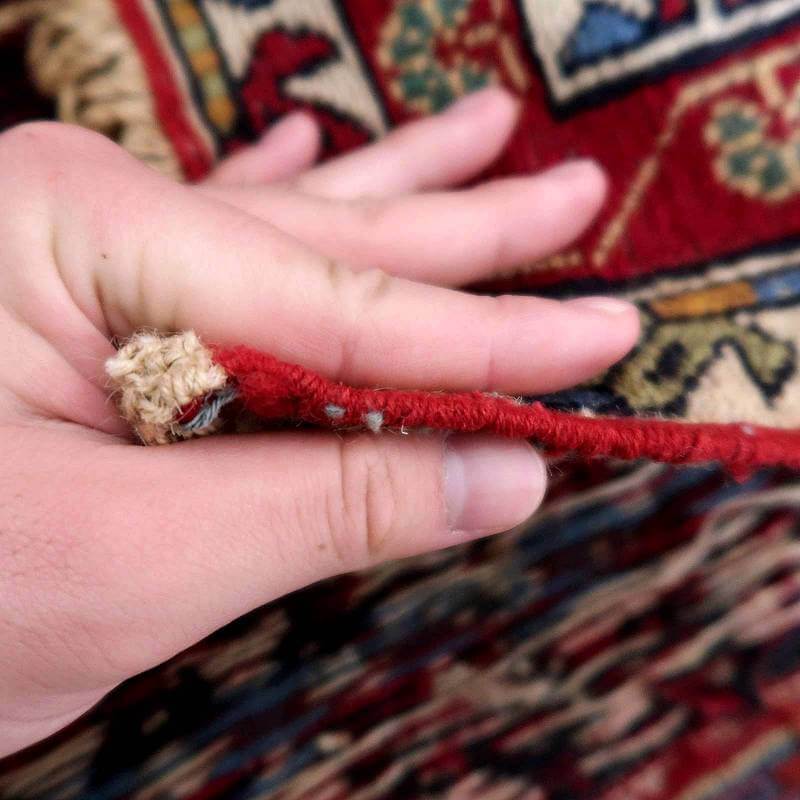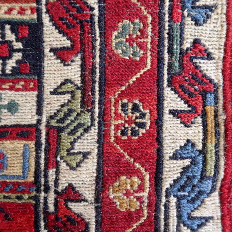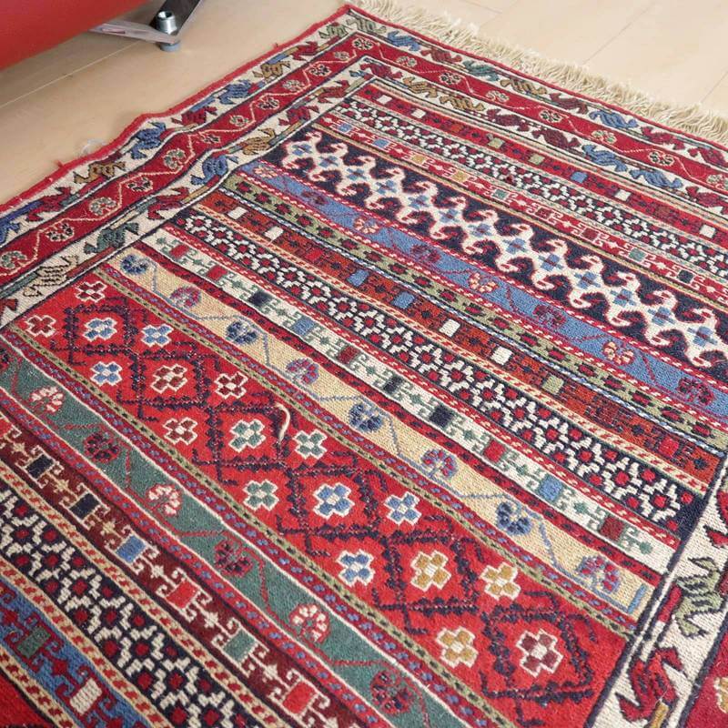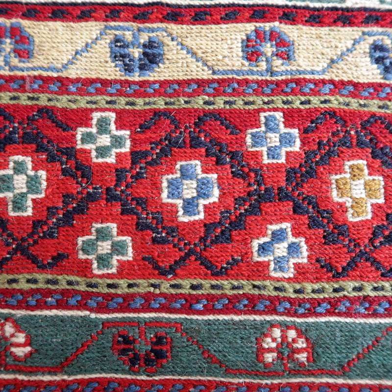 刺繍のように細かな文様が全面に施された美しいスマック織りのキリム。赤を基調に様々な色で文様が入った多色使いですが柄が細かいので落ち着きもあります。一目一目の模様をじっくり眺めて味わえるキリムでたいへん上質感があります。スマック織りは裏面に模様の糸を渡してあるので片面使いのキリムになります。スマック織りとは、イランのキリムの織り方の技法です。生地は刺繍のような仕上がりですが、これは後から刺したものではなく、土台の縦糸と横糸の上にもう一本横糸を絡めるように巻き込んで織っていく高度なテクニックで、生地を二重に織るため通常の平織りのキリムより倍の手間ひまが掛かる分高価になりますが、非常に堅固で丈夫、また普通より細かなデザインを描けるという長所がありますので、価格以上の価値を感じて頂けるキリムです。