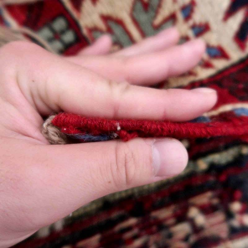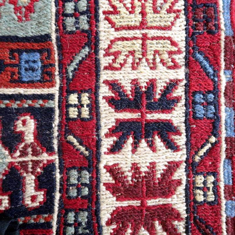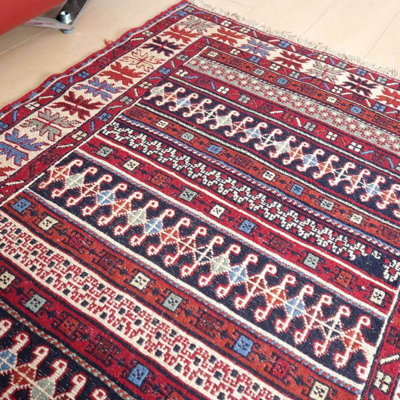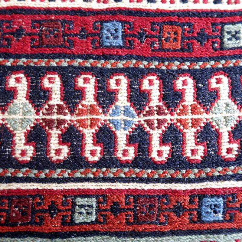 刺繍のように細かな文様が全面に施された美しいスマック織りのキリム。赤を基調に様々な色で文様が入った多色使いですが柄が細かいので落ち着きもあります。一目一目の模様をじっくり眺めて味わえるキリムでたいへん上質感があります。スマック織りは裏面に模様の糸を渡してあるので片面使いのキリムになります。スマック織りとは、イランのキリムの織り方の技法です。生地は刺繍のような仕上がりですが、これは後から刺したものではなく、土台の縦糸と横糸の上にもう一本横糸を絡めるように巻き込んで織っていく高度なテクニックで、生地を二重に織るため通常の平織りのキリムより倍の手間ひまが掛かる分高価になりますが、非常に堅固で丈夫、また普通より細かなデザインを描けるという長所がありますので、価格以上の価値を感じて頂けるキリムです。