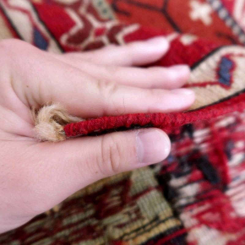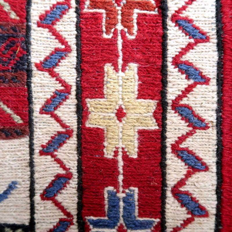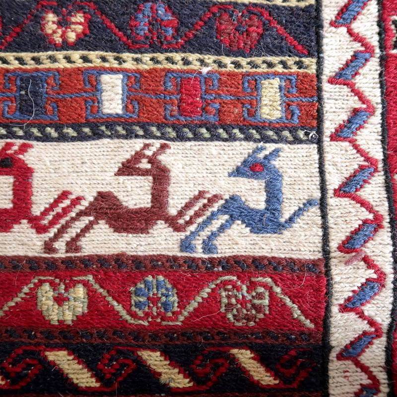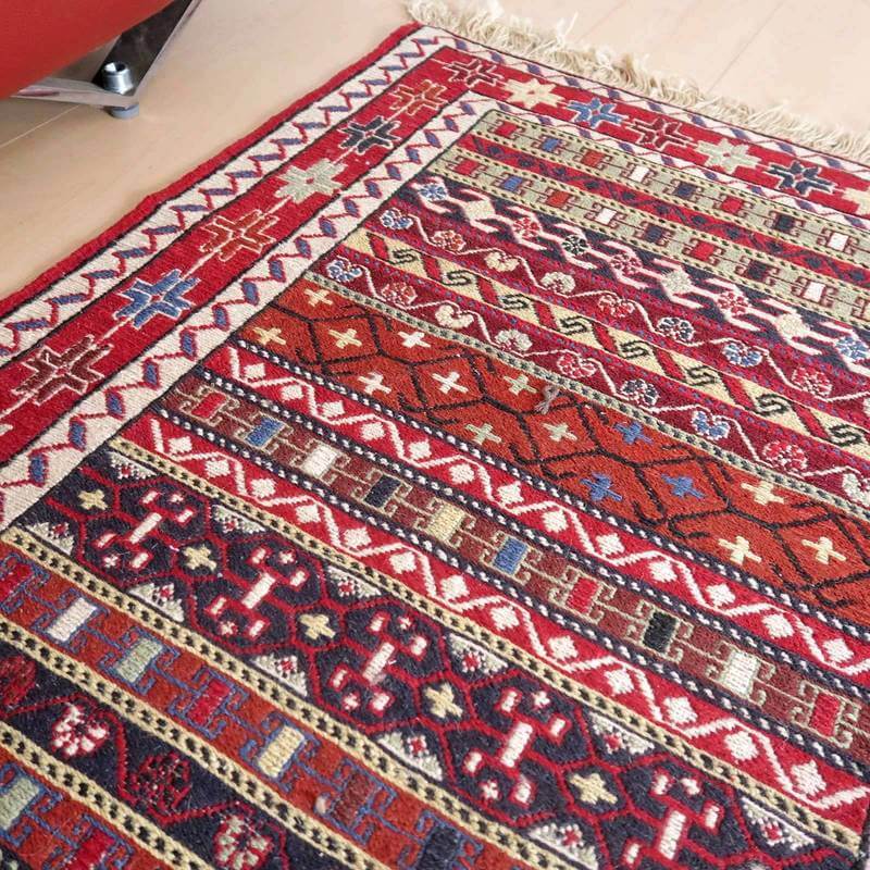 刺繍のように細かな文様が全面に施された美しいスマック織りのキリム。赤を基調に様々な色で文様が入った多色使いですが柄が細かいので落ち着きもあります。一目一目の模様をじっくり眺めて味わえるキリムでたいへん上質感があります。スマック織りは裏面に模様の糸を渡してあるので片面使いのキリムになります。スマック織りとは、イランのキリムの織り方の技法です。生地は刺繍のような仕上がりですが、これは後から刺したものではなく、土台の縦糸と横糸の上にもう一本横糸を絡めるように巻き込んで織っていく高度なテクニックで、生地を二重に織るため通常の平織りのキリムより倍の手間ひまが掛かる分高価になりますが、非常に堅固で丈夫、また普通より細かなデザインを描けるという長所がありますので、価格以上の価値を感じて頂けるキリムです。