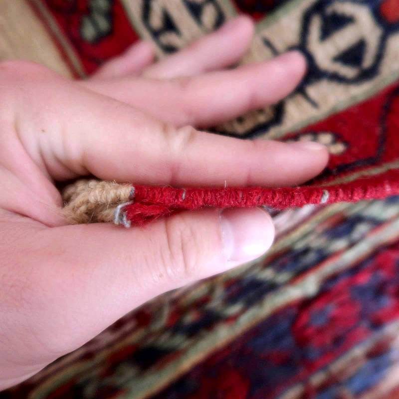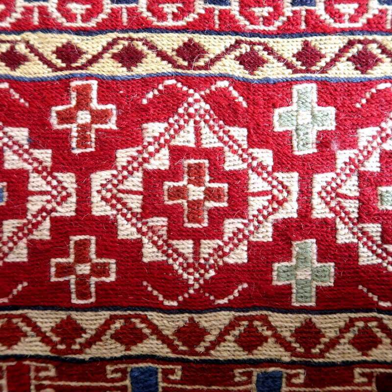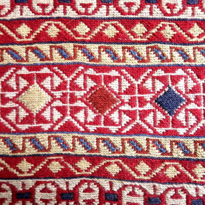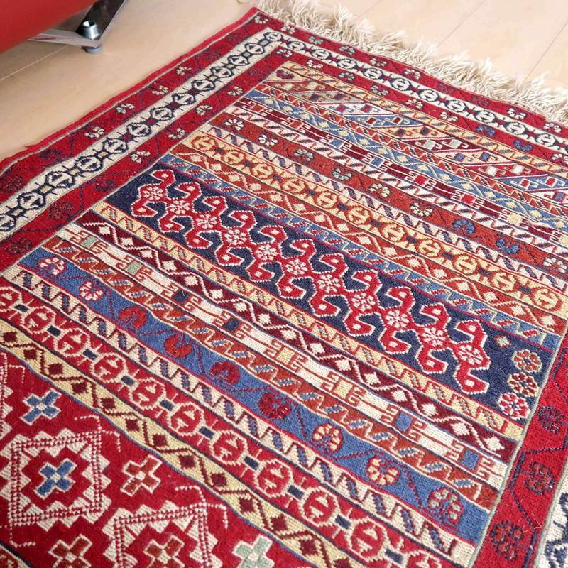刺繍のように細かな文様が全面に施された美しいスマック織りのキリム。赤を基調に様々な色で文様が入った多色使いですが柄が細かいので落ち着きもあります。一目一目の模様をじっくり眺めて味わえるキリムでたいへん上質感があります。スマック織りは裏面に模様の糸を渡してあるので片面使いのキリムになります。スマック織りとは、イランのキリムの織り方の技法です。生地は刺繍のような仕上がりですが、これは後から刺したものではなく、土台の縦糸と横糸の上にもう一本横糸を絡めるように巻き込んで織っていく高度なテクニックで、生地を二重に織るため通常の平織りのキリムより倍の手間ひまが掛かる分高価になりますが、非常に堅固で丈夫、また普通より細かなデザインを描けるという長所がありますので、価格以上の価値を感じて頂けるキリムです。