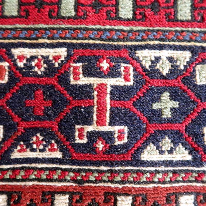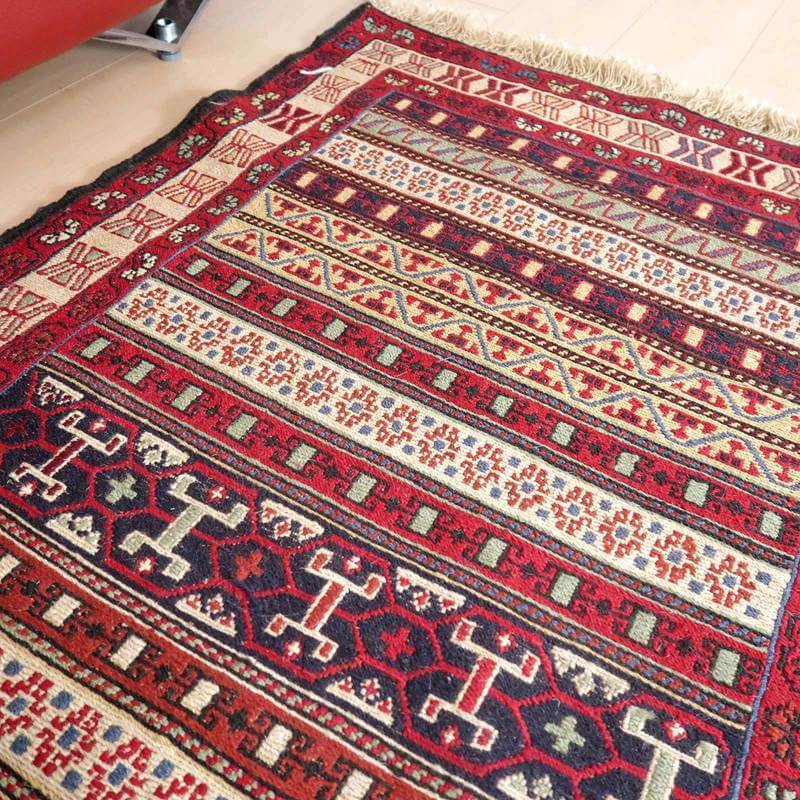 刺繍のように細かな文様が全面に施された美しいスマック織りのキリム。赤を基調に様々な色で文様が入った多色使いですが柄が細かいので落ち着きもあります。一目一目の模様をじっくり眺めて味わえるキリムでたいへん上質感があります。スマック織りは裏面に模様の糸を渡してあるので片面使いのキリムになります。スマック織りとは、イランのキリムの織り方の技法です。生地は刺繍のような仕上がりですが、これは後から刺したものではなく、土台の縦糸と横糸の上にもう一本横糸を絡めるように巻き込んで織っていく高度なテクニックで、生地を二重に織るため通常の平織りのキリムより倍の手間ひまが掛かる分高価になりますが、非常に堅固で丈夫、また普通より細かなデザインを描けるという長所がありますので、価格以上の価値を感じて頂けるキリムです。