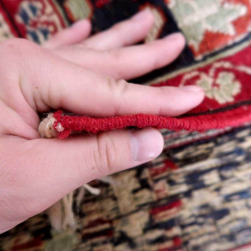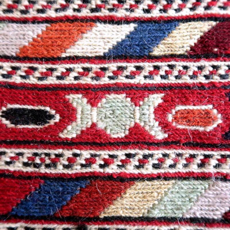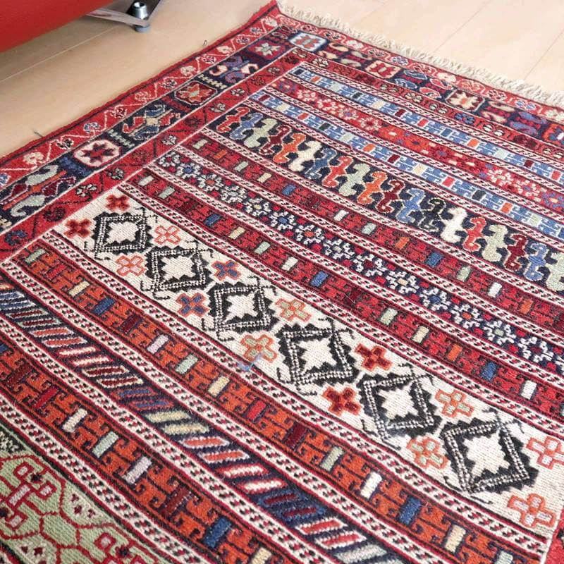 刺繍のように細かな文様が全面に施された美しいスマック織りのキリム。赤を基調に様々な色で文様が入った多色使いですが柄が細かいので落ち着きもあります。一目一目の模様をじっくり眺めて味わえるキリムでたいへん上質感があります。スマック織りは裏面に模様の糸を渡してあるので片面使いのキリムになります。スマック織りとは、イランのキリムの織り方の技法です。生地は刺繍のような仕上がりですが、これは後から刺したものではなく、土台の縦糸と横糸の上にもう一本横糸を絡めるように巻き込んで織っていく高度なテクニックで、生地を二重に織るため通常の平織りのキリムより倍の手間ひまが掛かる分高価になりますが、非常に堅固で丈夫、また普通より細かなデザインを描けるという長所がありますので、価格以上の価値を感じて頂けるキリムです。