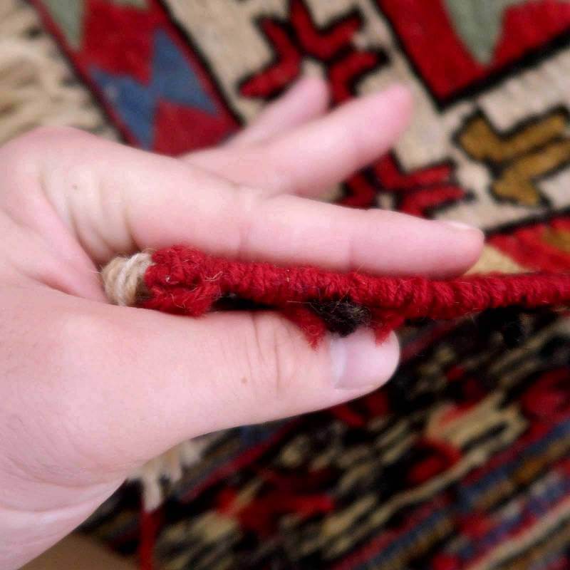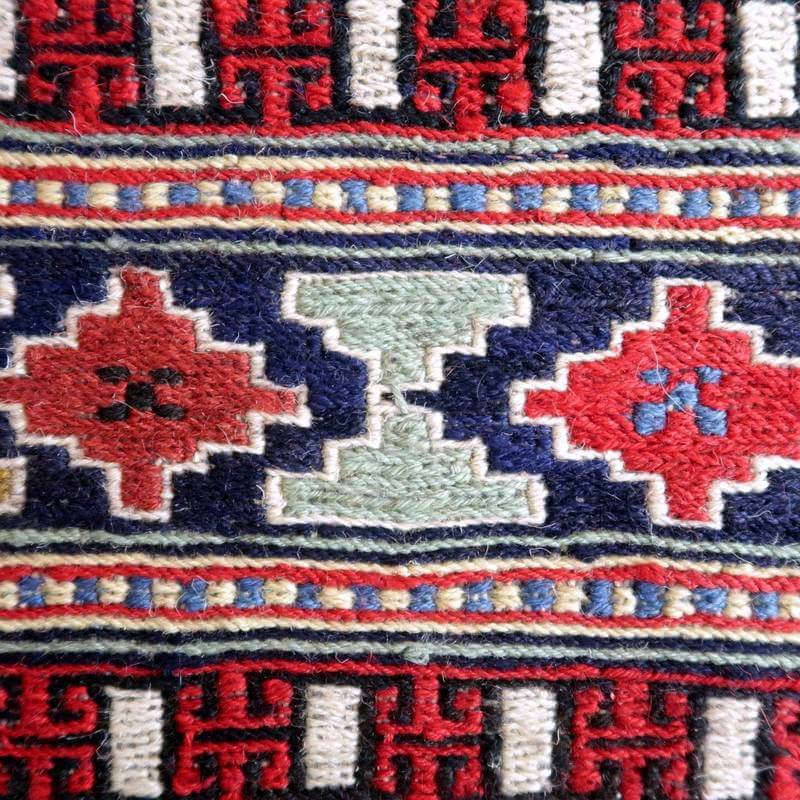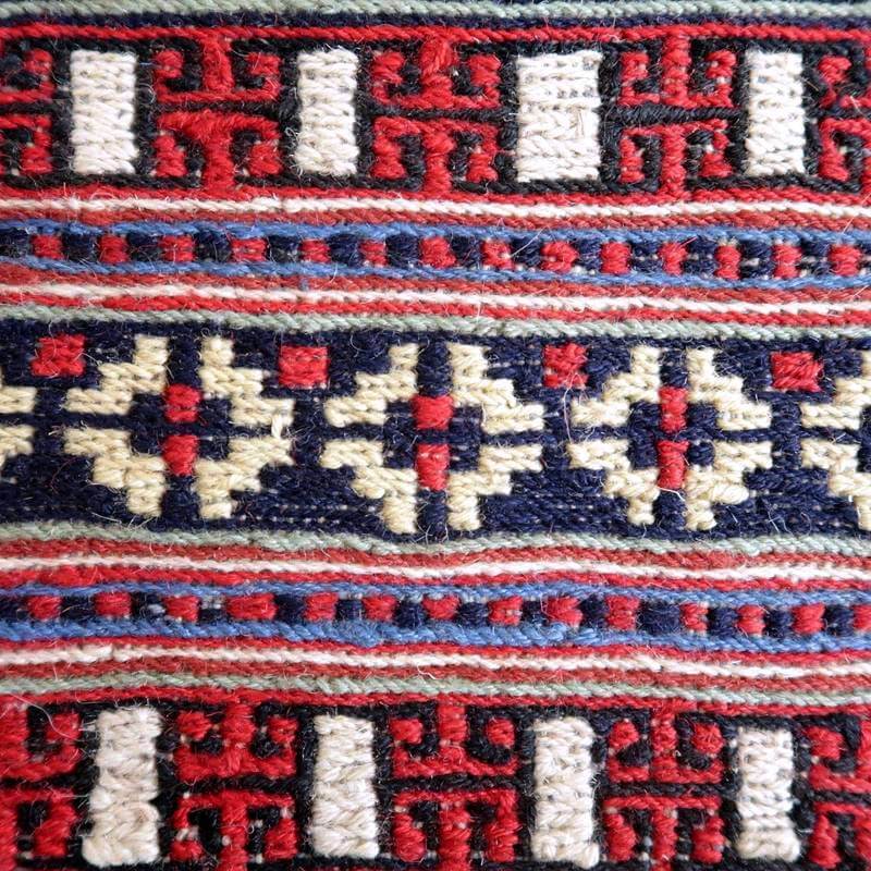 刺繍のように細かな文様が全面に施された美しいスマック織りのキリム。赤を基調に様々な色で文様が入った多色使いですが柄が細かいので落ち着きもあります。一目一目の模様をじっくり眺めて味わえるキリムでたいへん上質感があります。スマック織りは裏面に模様の糸を渡してあるので片面使いのキリムになります。スマック織りとは、イランのキリムの織り方の技法です。生地は刺繍のような仕上がりですが、これは後から刺したものではなく、土台の縦糸と横糸の上にもう一本横糸を絡めるように巻き込んで織っていく高度なテクニックで、生地を二重に織るため通常の平織りのキリムより倍の手間ひまが掛かる分高価になりますが、非常に堅固で丈夫、また普通より細かなデザインを描けるという長所がありますので、価格以上の価値を感じて頂けるキリムです。