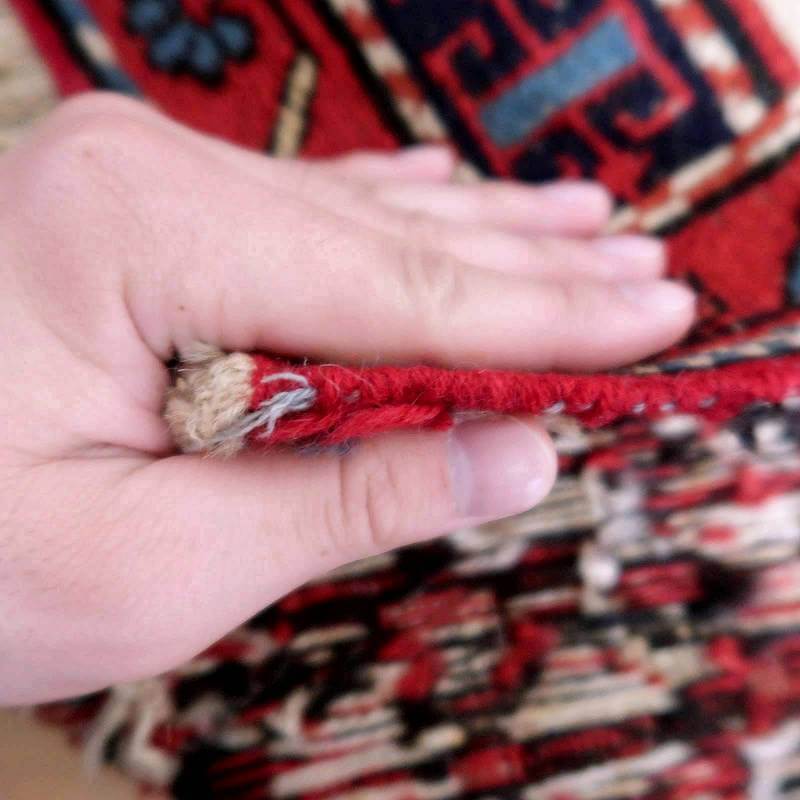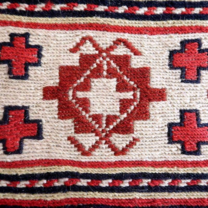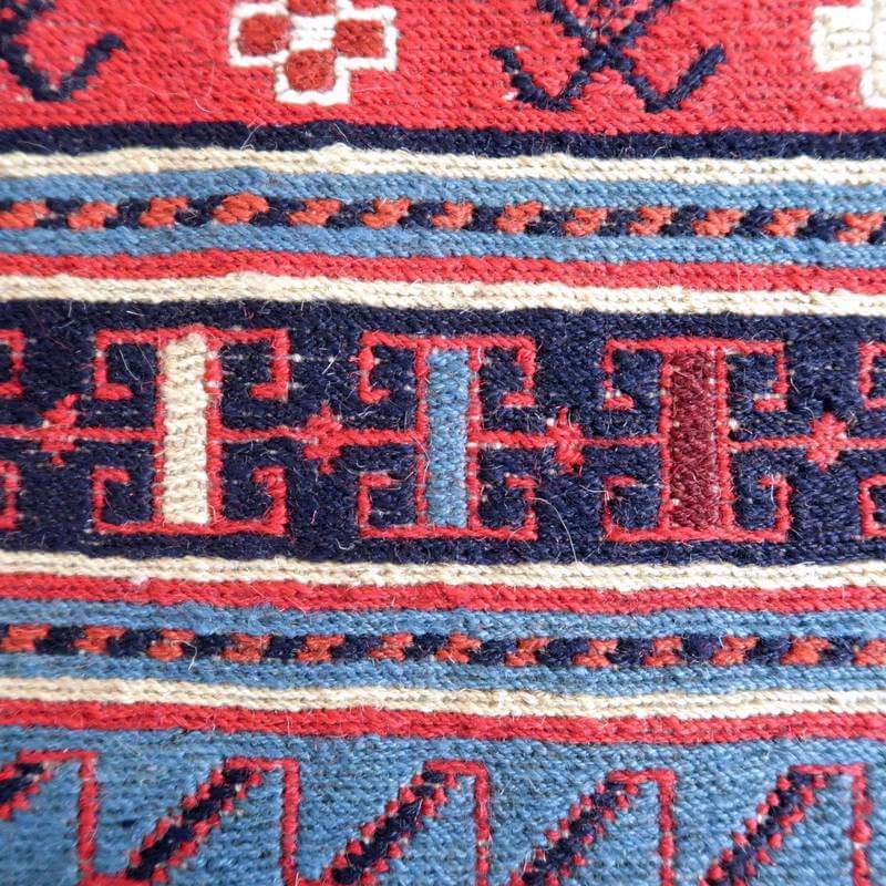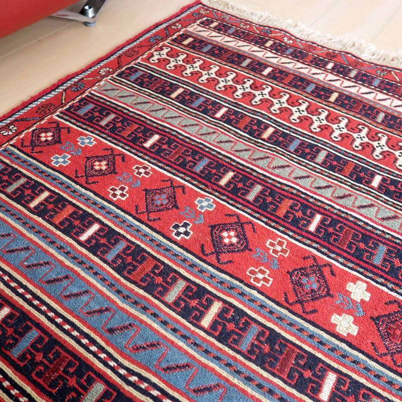 刺繍のように細かな文様が全面に施された美しいスマック織りのキリム。赤を基調に様々な色で文様が入った多色使いですが柄が細かいので落ち着きもあります。一目一目の模様をじっくり眺めて味わえるキリムでたいへん上質感があります。スマック織りは裏面に模様の糸を渡してあるので片面使いのキリムになります。スマック織りとは、イランのキリムの織り方の技法です。生地は刺繍のような仕上がりですが、これは後から刺したものではなく、土台の縦糸と横糸の上にもう一本横糸を絡めるように巻き込んで織っていく高度なテクニックで、生地を二重に織るため通常の平織りのキリムより倍の手間ひまが掛かる分高価になりますが、非常に堅固で丈夫、また普通より細かなデザインを描けるという長所がありますので、価格以上の価値を感じて頂けるキリムです。
