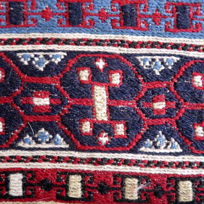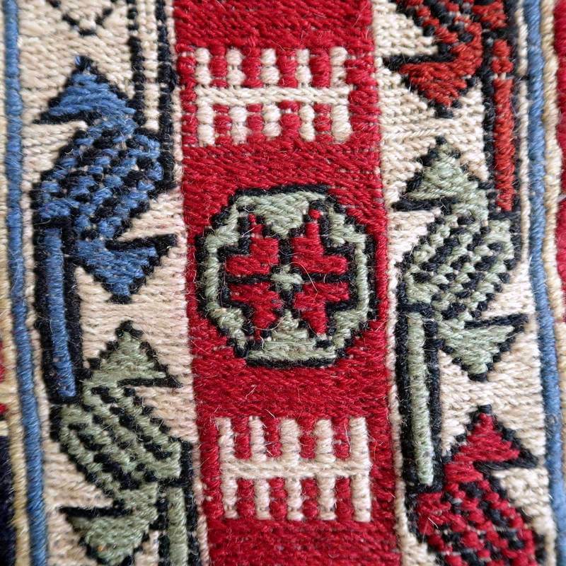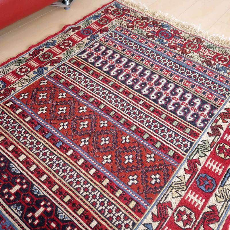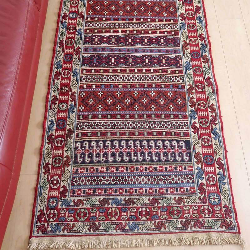 刺繍のように細かな文様が全面に施された美しいスマック織りのキリム。赤を基調に様々な色で文様が入った多色使いですが柄が細かいので落ち着きもあります。一目一目の模様をじっくり眺めて味わえるキリムでたいへん上質感があります。スマック織りは裏面に模様の糸を渡してあるので片面使いのキリムになります。スマック織りとは、イランのキリムの織り方の技法です。生地は刺繍のような仕上がりですが、これは後から刺したものではなく、土台の縦糸と横糸の上にもう一本横糸を絡めるように巻き込んで織っていく高度なテクニックで、生地を二重に織るため通常の平織りのキリムより倍の手間ひまが掛かる分高価になりますが、非常に堅固で丈夫、また普通より細かなデザインを描けるという長所がありますので、価格以上の価値を感じて頂けるキリムです。