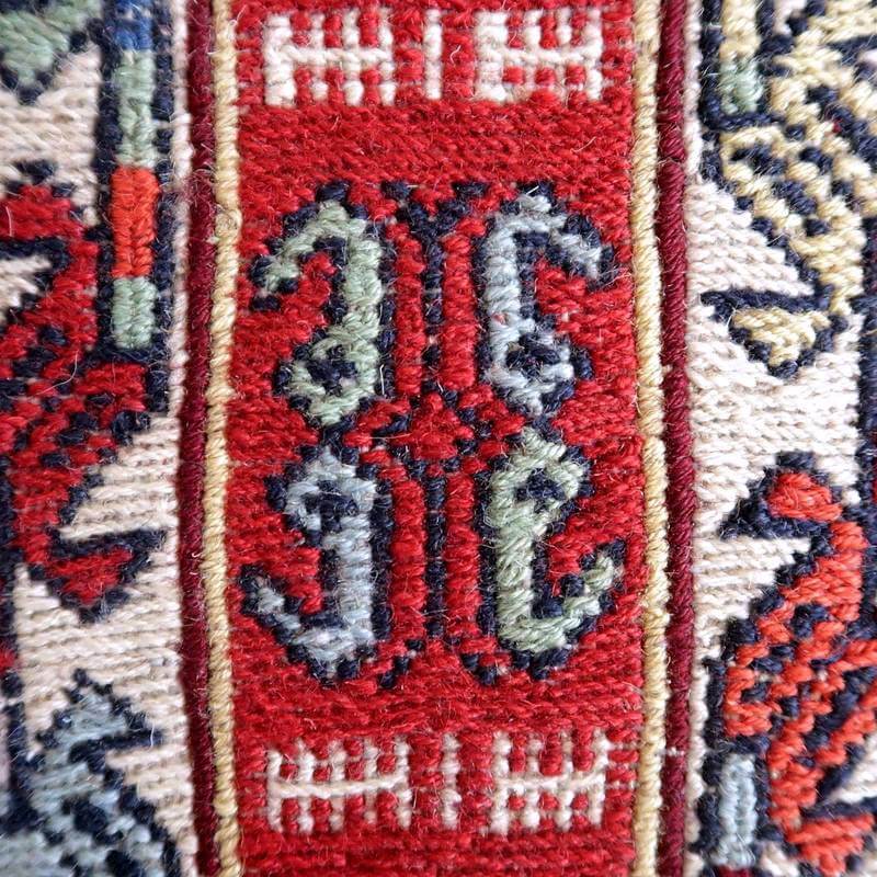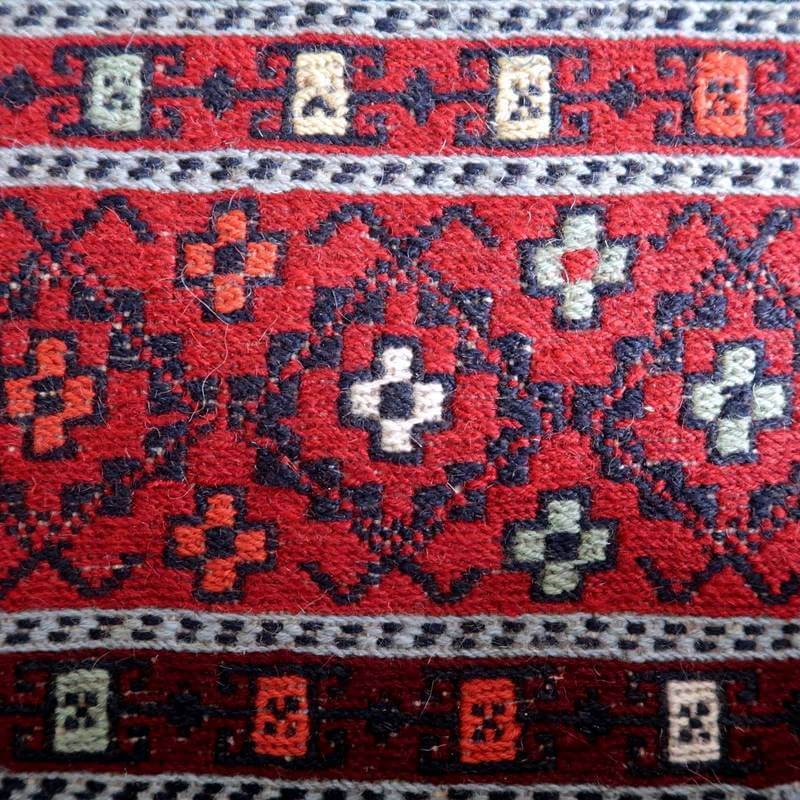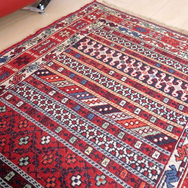 刺繍のように細かな文様が全面に施された美しいスマック織りのキリム。赤を基調に様々な色で文様が入った多色使いですが柄が細かいので落ち着きもあります。一目一目の模様をじっくり眺めて味わえるキリムでたいへん上質感があります。スマック織りは裏面に模様の糸を渡してあるので片面使いのキリムになります。スマック織りとは、イランのキリムの織り方の技法です。生地は刺繍のような仕上がりですが、これは後から刺したものではなく、土台の縦糸と横糸の上にもう一本横糸を絡めるように巻き込んで織っていく高度なテクニックで、生地を二重に織るため通常の平織りのキリムより倍の手間ひまが掛かる分高価になりますが、非常に堅固で丈夫、また普通より細かなデザインを描けるという長所がありますので、価格以上の価値を感じて頂けるキリムです。