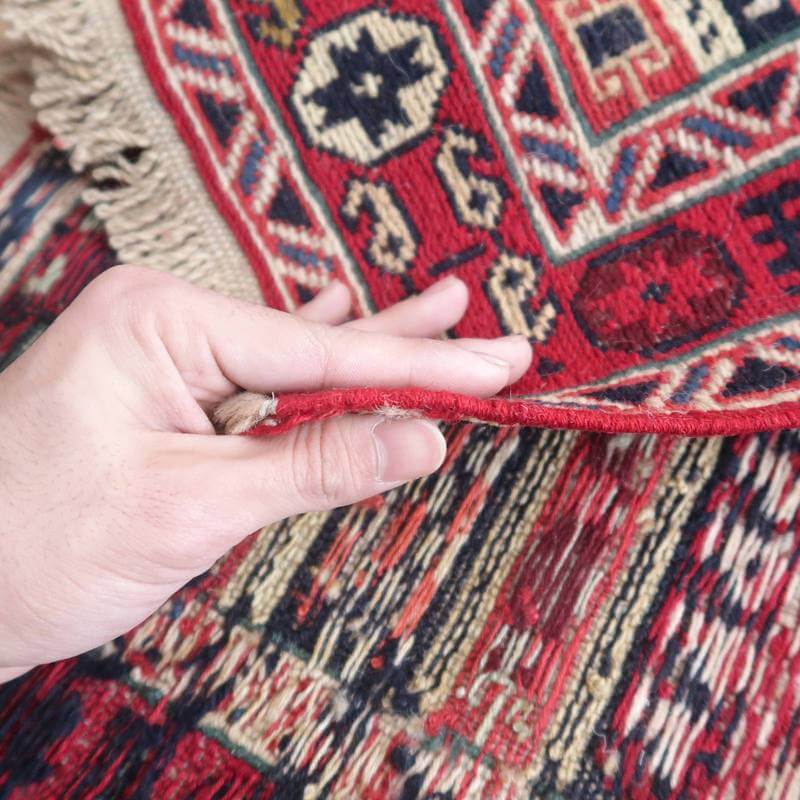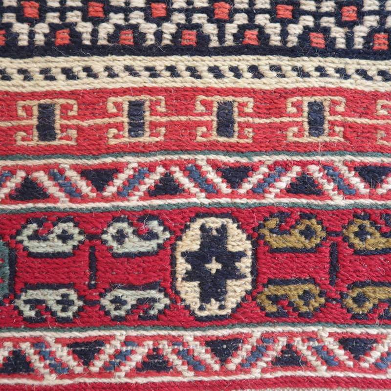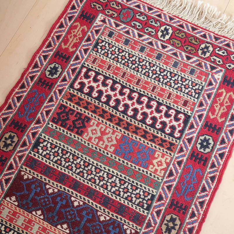 刺繍のように細かな文様が全面に施された美しいスマック織りのキリム。赤を基調に様々な色で文様が入った多色使いですが柄が細かいので落ち着きもあります。一目一目の模様をじっくり眺めて味わえるキリムでたいへん上質感があります。スマック織りは裏面に模様の糸を渡してあるので片面使いのキリムになります。スマック織りとは、イランのキリムの織り方の技法です。生地は刺繍のような仕上がりですが、これは後から刺したものではなく、土台の縦糸と横糸の上にもう一本横糸を絡めるように巻き込んで織っていく高度なテクニックで、生地を二重に織るため通常の平織りのキリムより倍の手間ひまが掛かる分高価になりますが、非常に堅固で丈夫、また普通より細かなデザインを描けるという長所がありますので、価格以上の価値を感じて頂けるキリムです。