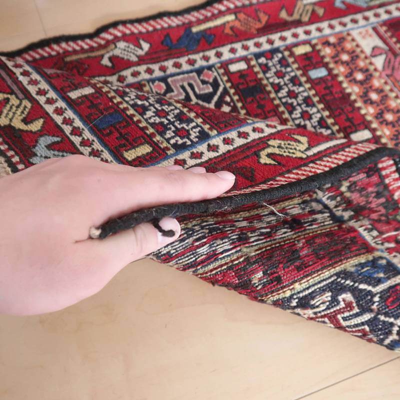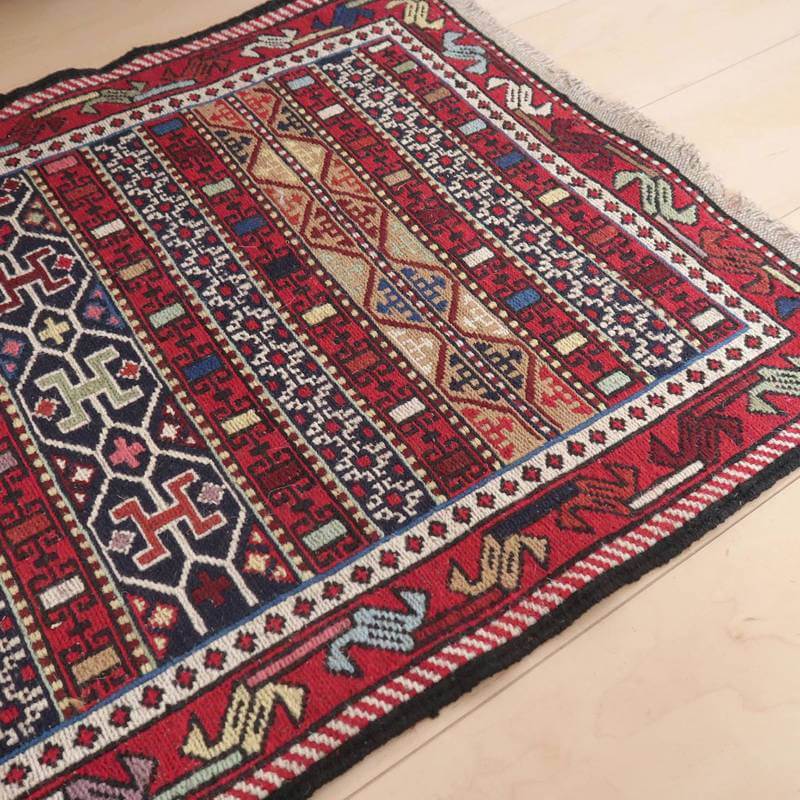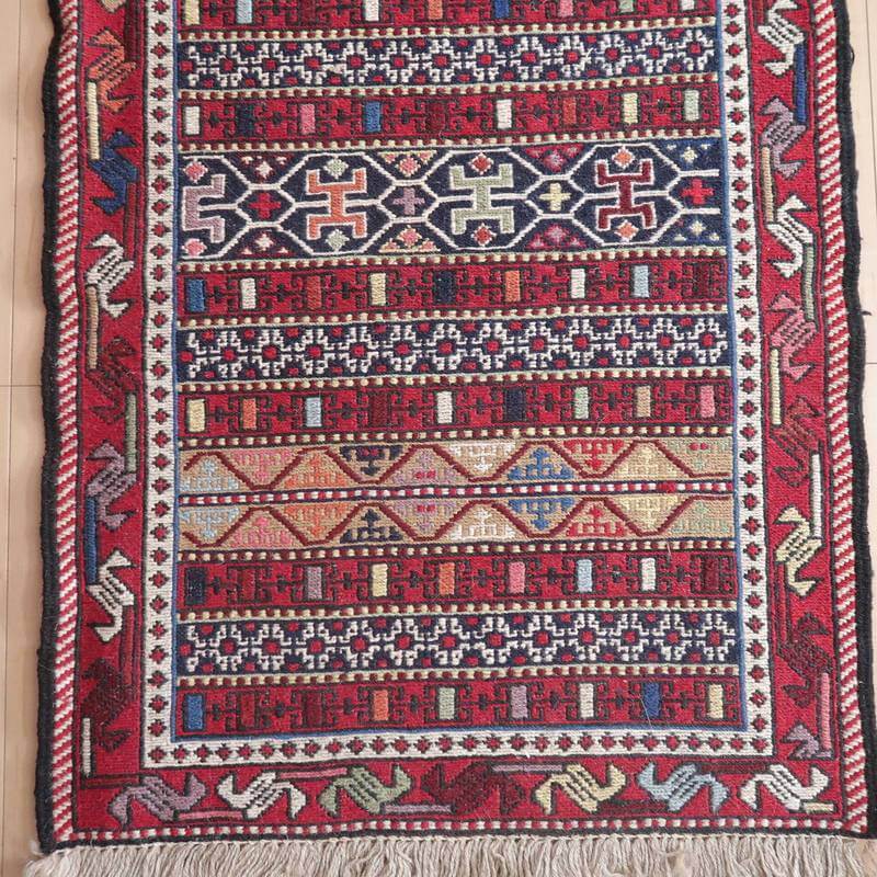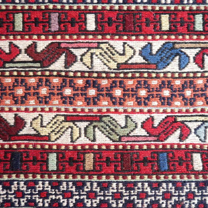 刺繍のように細かな文様が全面に施された美しいスマック織りのキリム。赤を基調に様々な色で文様が入った多色使いですが柄が細かいので落ち着きもあります。一目一目の模様をじっくり眺めて味わえるキリムでたいへん上質感があります。スマック織りは裏面に模様の糸を渡してあるので片面使いのキリムになります。スマック織りとは、イランのキリムの織り方の技法です。生地は刺繍のような仕上がりですが、これは後から刺したものではなく、土台の縦糸と横糸の上にもう一本横糸を絡めるように巻き込んで織っていく高度なテクニックで、生地を二重に織るため通常の平織りのキリムより倍の手間ひまが掛かる分高価になりますが、非常に堅固で丈夫、また普通より細かなデザインを描けるという長所がありますので、価格以上の価値を感じて頂けるキリムです。