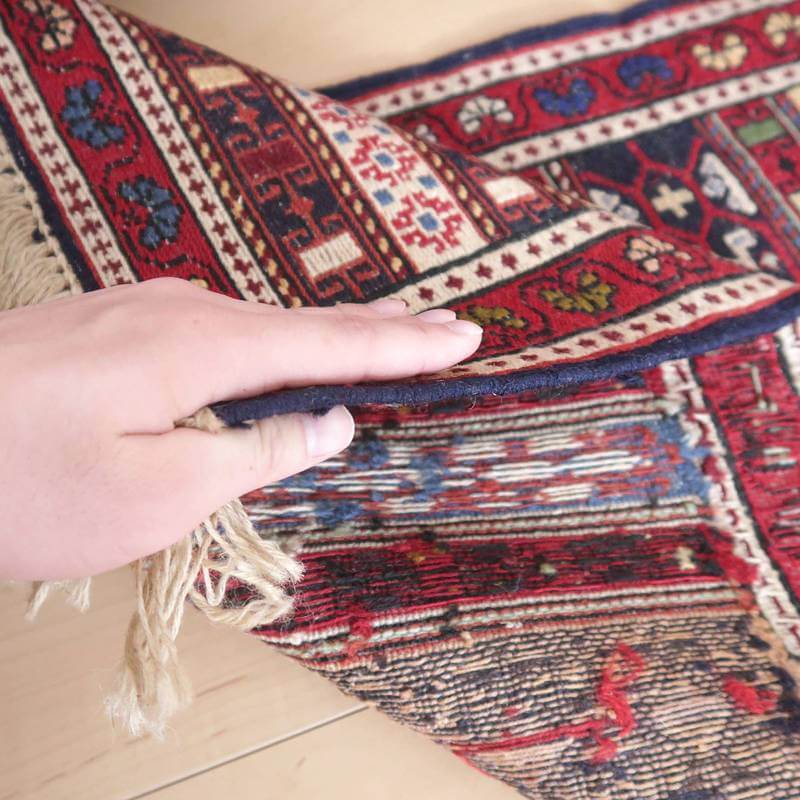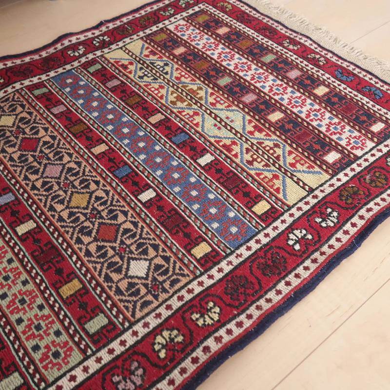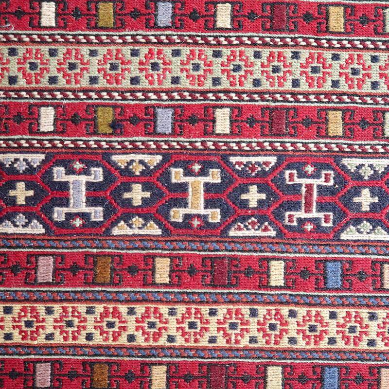 刺繍のように細かな文様が全面に施された美しいスマック織りのキリム。赤を基調に様々な色で文様が入った多色使いですが柄が細かいので落ち着きもあります。一目一目の模様をじっくり眺めて味わえるキリムでたいへん上質感があります。スマック織りは裏面に模様の糸を渡してあるので片面使いのキリムになります。スマック織りとは、イランのキリムの織り方の技法です。生地は刺繍のような仕上がりですが、これは後から刺したものではなく、土台の縦糸と横糸の上にもう一本横糸を絡めるように巻き込んで織っていく高度なテクニックで、生地を二重に織るため通常の平織りのキリムより倍の手間ひまが掛かる分高価になりますが、非常に堅固で丈夫、また普通より細かなデザインを描けるという長所がありますので、価格以上の価値を感じて頂けるキリムです。