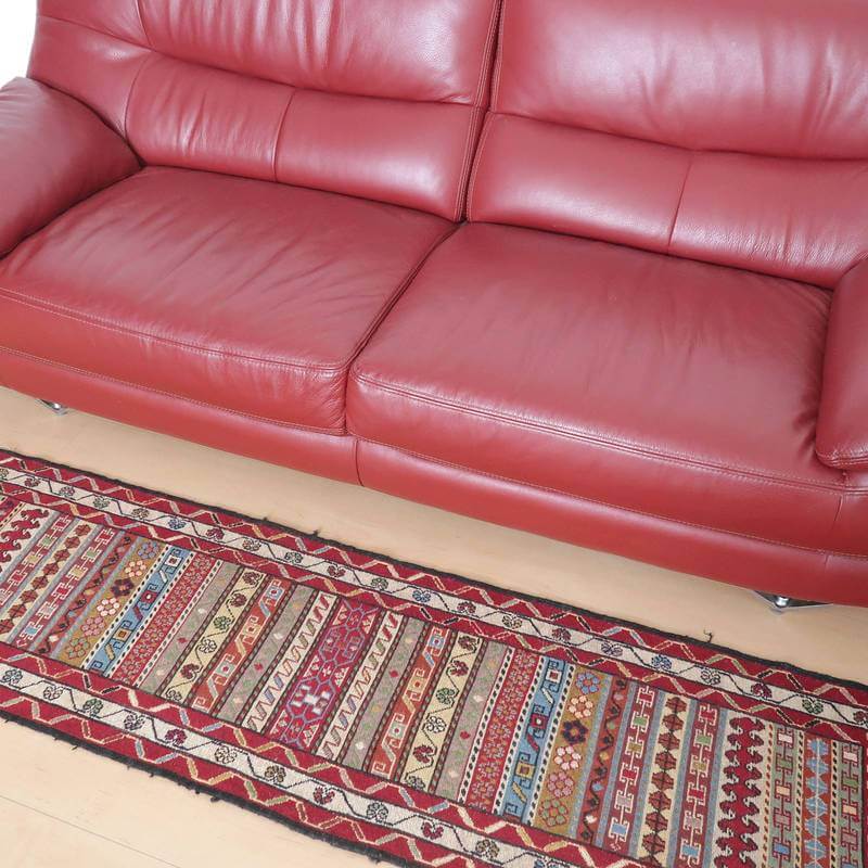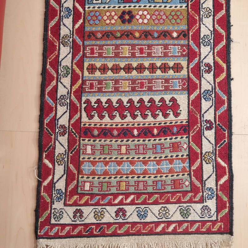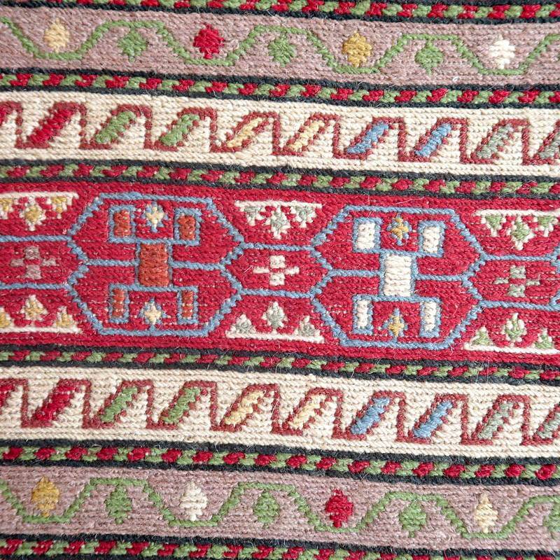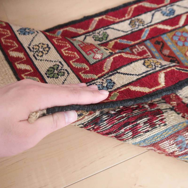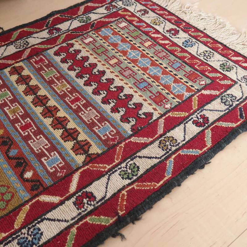刺繍のように細かな文様が全面に施された美しいスマック織りのキリム。赤を基調に様々な色で文様が入った多色使いですが柄が細かいので落ち着きもあります。一目一目の模様をじっくり眺めて味わえるキリムでたいへん上質感があります。スマック織りは裏面に模様の糸を渡してあるので片面使いのキリムになります。スマック織りとは、イランのキリムの織り方の技法です。生地は刺繍のような仕上がりですが、これは後から刺したものではなく、土台の縦糸と横糸の上にもう一本横糸を絡めるように巻き込んで織っていく高度なテクニックで、生地を二重に織るため通常の平織りのキリムより倍の手間ひまが掛かる分高価になりますが、非常に堅固で丈夫、また普通より細かなデザインを描けるという長所がありますので、価格以上の価値を感じて頂けるキリムです。
