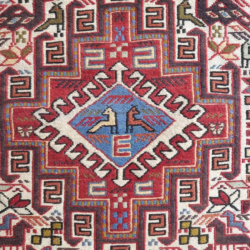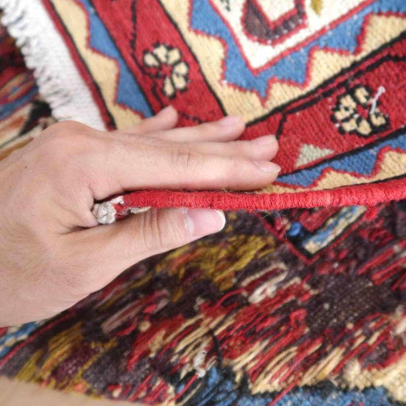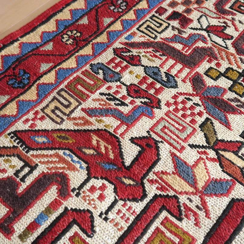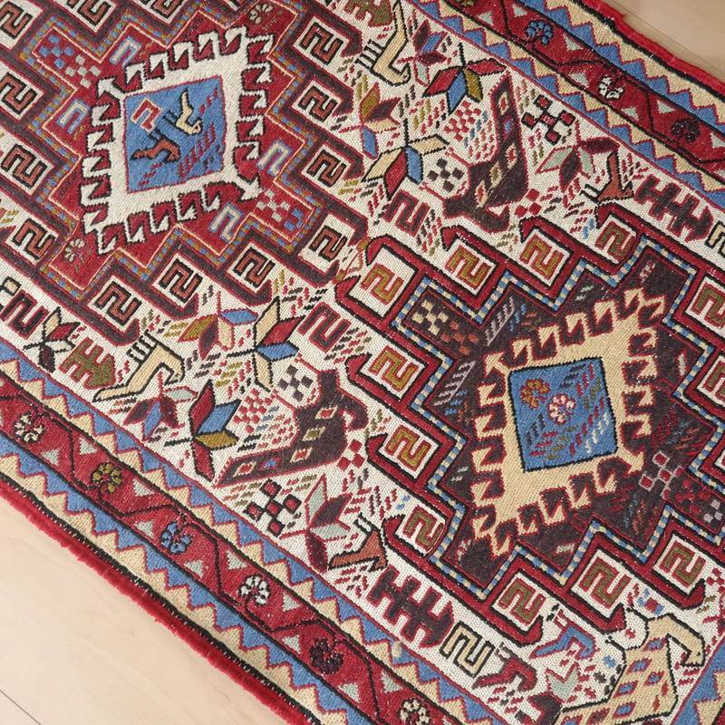刺繍のように細かな文様が全面に施された美しいスマック織りのキリム。赤を基調に様々な色で文様が入った多色使いですが柄が細かいので落ち着きもあります。一目一目の模様をじっくり眺めて味わえるキリムでたいへん上質感があります。スマック織りは裏面に模様の糸を渡してあるので片面使いのキリムになります。スマック織りとは、イランのキリムの織り方の技法です。生地は刺繍のような仕上がりですが、これは後から刺したものではなく、土台の縦糸と横糸の上にもう一本横糸を絡めるように巻き込んで織っていく高度なテクニックで、生地を二重に織るため通常の平織りのキリムより倍の手間ひまが掛かる分高価になりますが、非常に堅固で丈夫、また普通より細かなデザインを描けるという長所がありますので、価格以上の価値を感じて頂けるキリムです。