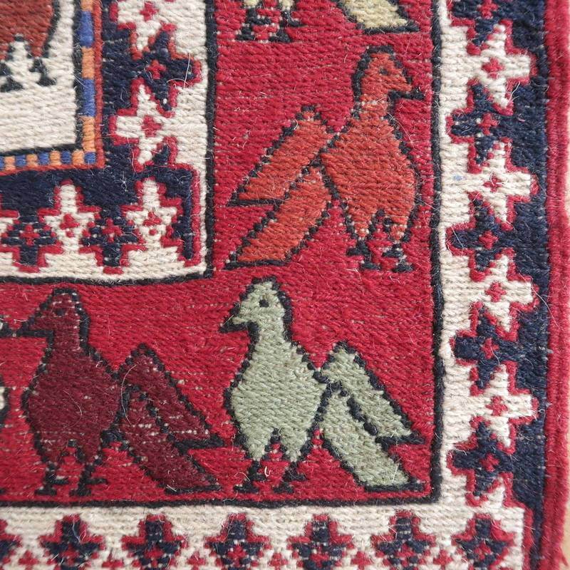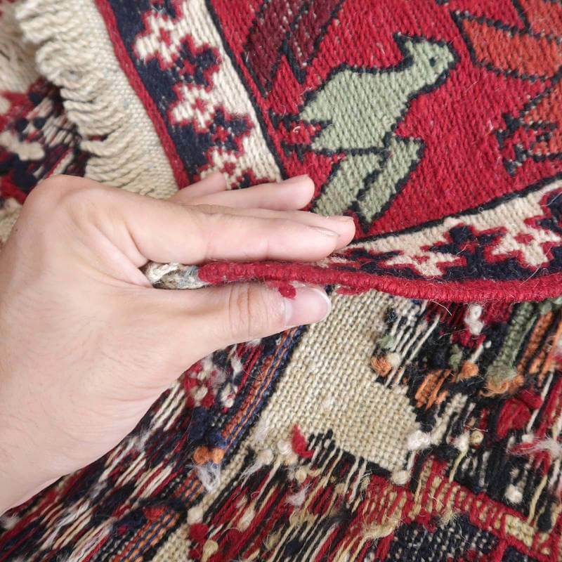 刺繍のように細かな文様が全面に施された美しいスマック織りのキリム。赤を基調に様々な色で文様が入った多色使いですが柄が細かいので落ち着きもあります。一目一目の模様をじっくり眺めて味わえるキリムでたいへん上質感があります。スマック織りは裏面に模様の糸を渡してあるので片面使いのキリムになります。スマック織りとは、イランのキリムの織り方の技法です。生地は刺繍のような仕上がりですが、これは後から刺したものではなく、土台の縦糸と横糸の上にもう一本横糸を絡めるように巻き込んで織っていく高度なテクニックで、生地を二重に織るため通常の平織りのキリムより倍の手間ひまが掛かる分高価になりますが、非常に堅固で丈夫、また普通より細かなデザインを描けるという長所がありますので、価格以上の価値を感じて頂けるキリムです。
