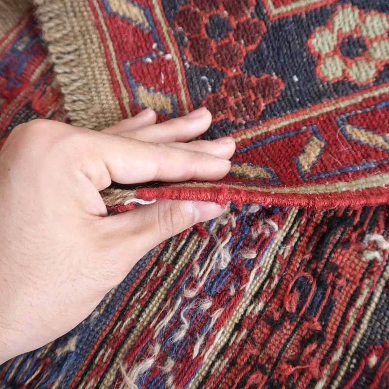 刺繍のように細かな文様が全面に施された美しいスマック織りのキリム。赤を基調に様々な色で文様が入った多色使いですが柄が細かいので落ち着きもあります。一目一目の模様をじっくり眺めて味わえるキリムでたいへん上質感があります。スマック織りは裏面に模様の糸を渡してあるので片面使いのキリムになります。スマック織りとは、イランのキリムの織り方の技法です。生地は刺繍のような仕上がりですが、これは後から刺したものではなく、土台の縦糸と横糸の上にもう一本横糸を絡めるように巻き込んで織っていく高度なテクニックで、生地を二重に織るため通常の平織りのキリムより倍の手間ひまが掛かる分高価になりますが、非常に堅固で丈夫、また普通より細かなデザインを描けるという長所がありますので、価格以上の価値を感じて頂けるキリムです。