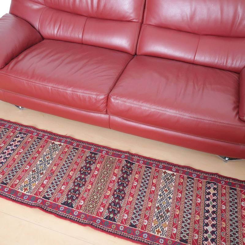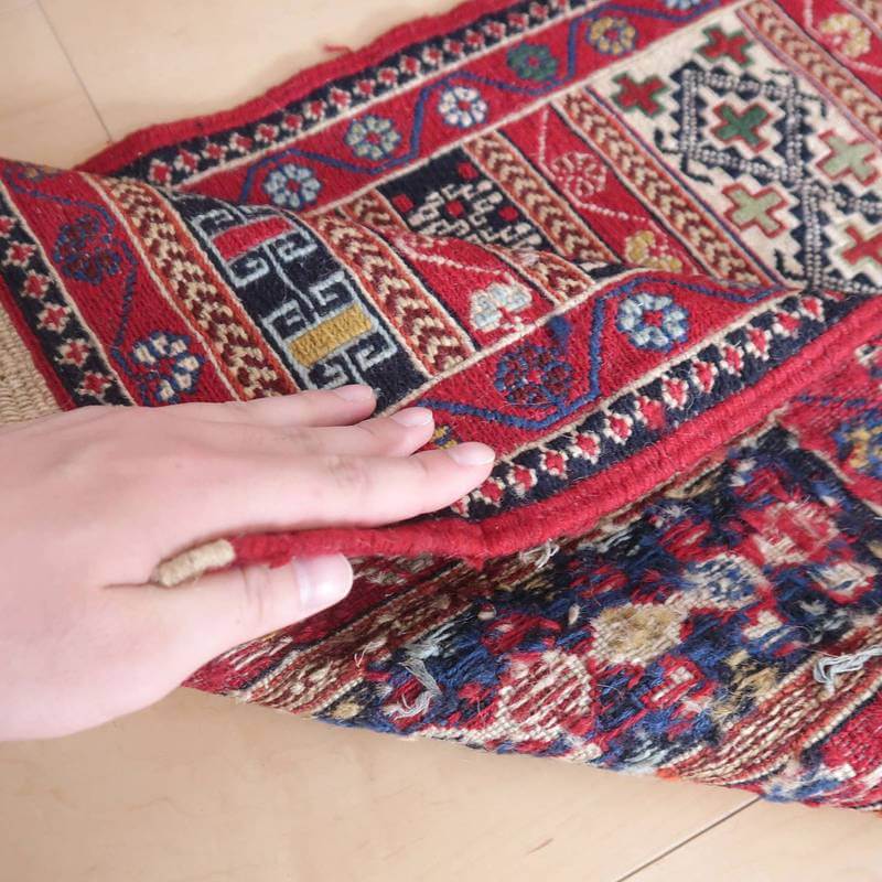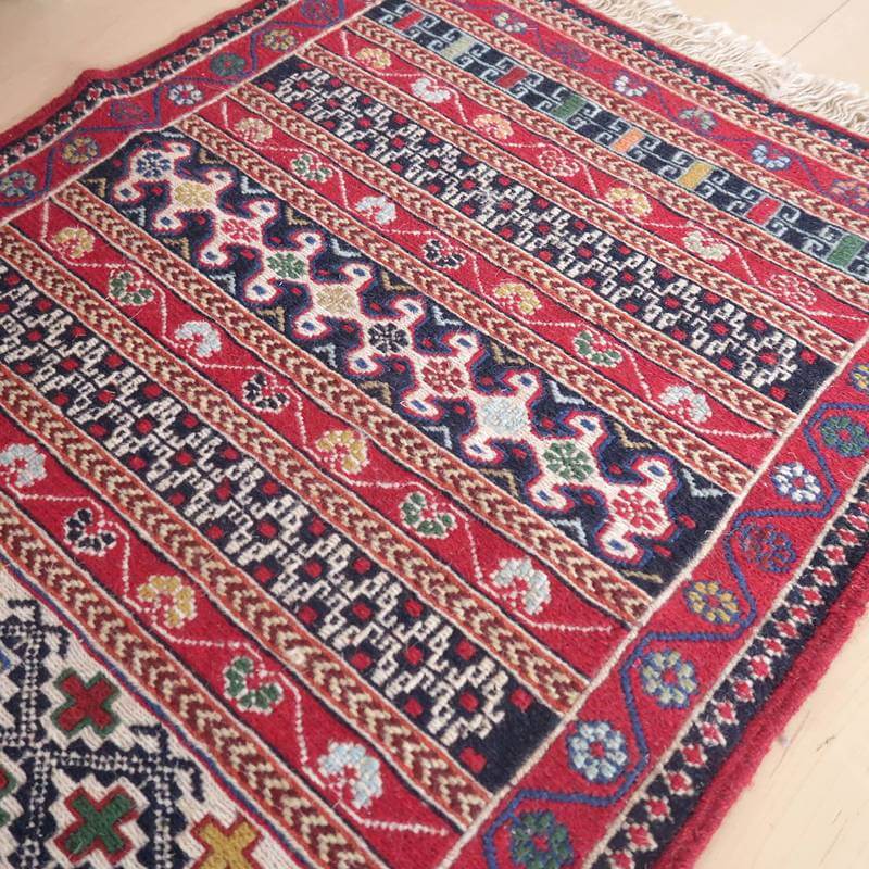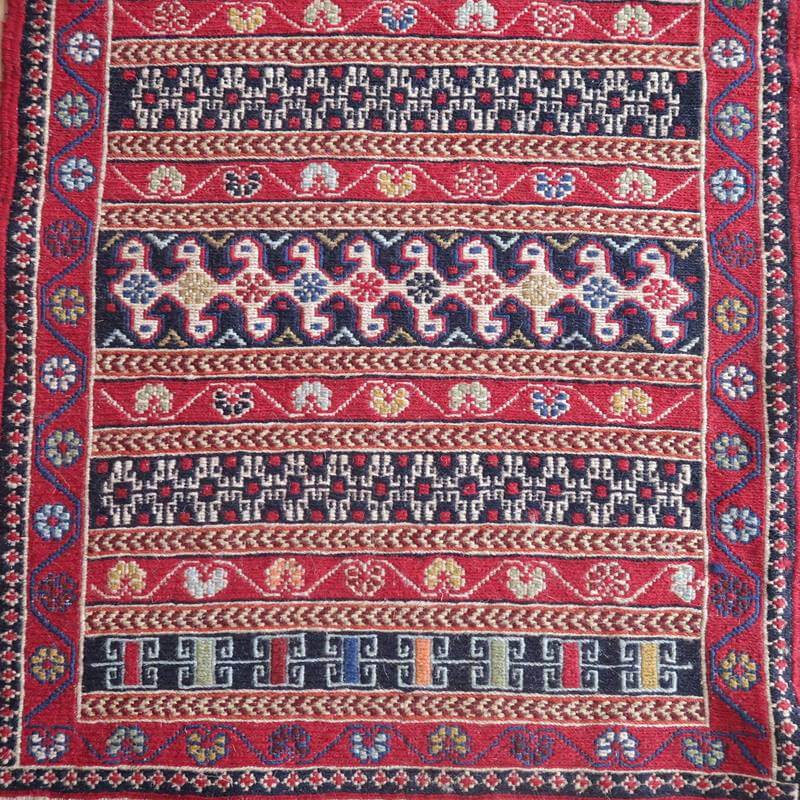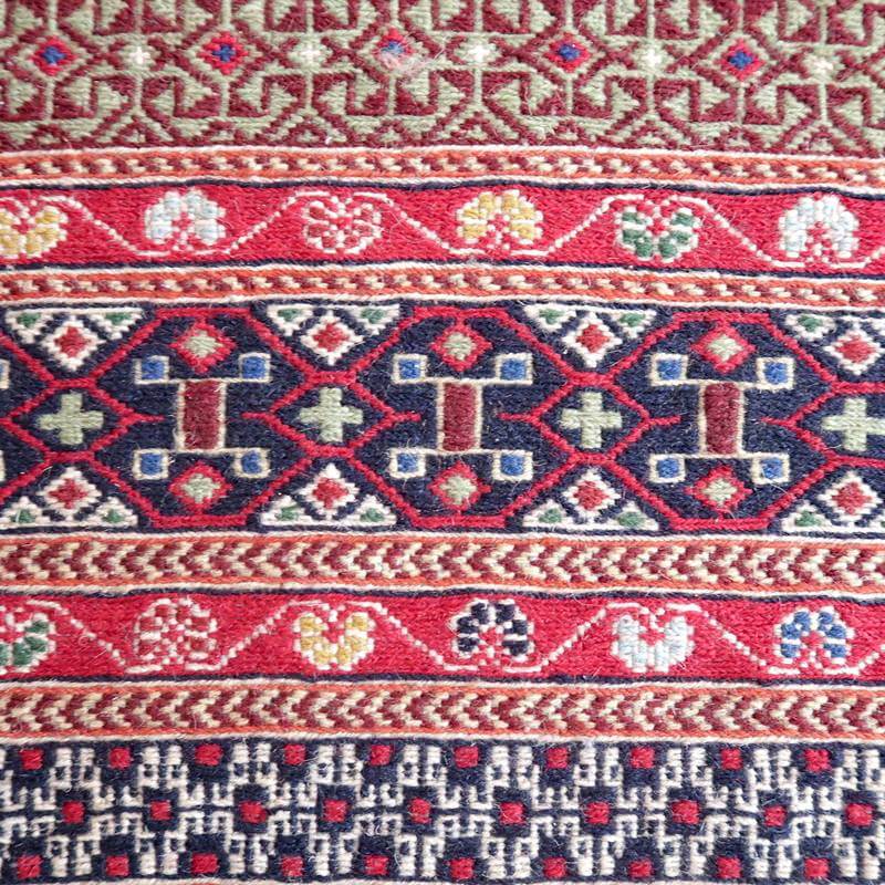 刺繍のように細かな文様が全面に施された美しいスマック織りのキリム。赤を基調に様々な色で文様が入った多色使いですが柄が細かいので落ち着きもあります。一目一目の模様をじっくり眺めて味わえるキリムでたいへん上質感があります。スマック織りは裏面に模様の糸を渡してあるので片面使いのキリムになります。スマック織りとは、イランのキリムの織り方の技法です。生地は刺繍のような仕上がりですが、これは後から刺したものではなく、土台の縦糸と横糸の上にもう一本横糸を絡めるように巻き込んで織っていく高度なテクニックで、生地を二重に織るため通常の平織りのキリムより倍の手間ひまが掛かる分高価になりますが、非常に堅固で丈夫、また普通より細かなデザインを描けるという長所がありますので、価格以上の価値を感じて頂けるキリムです。