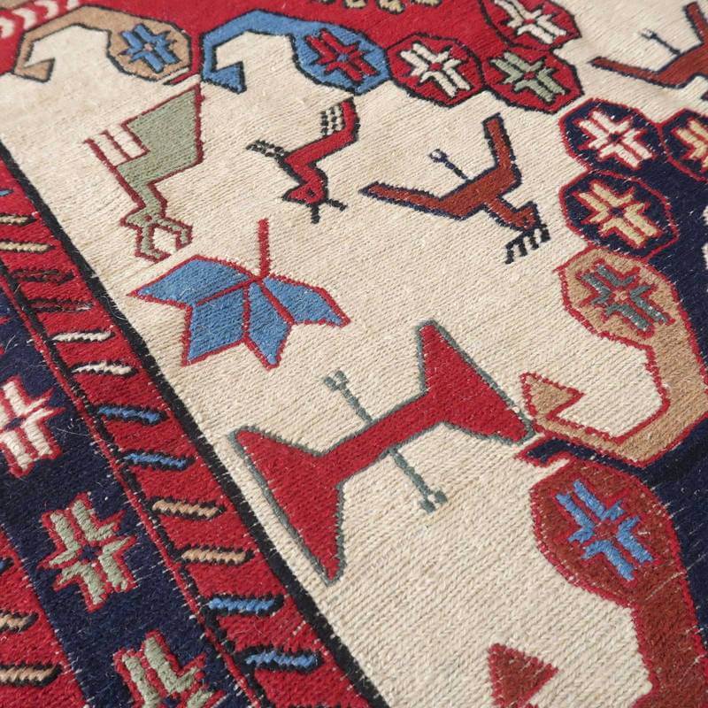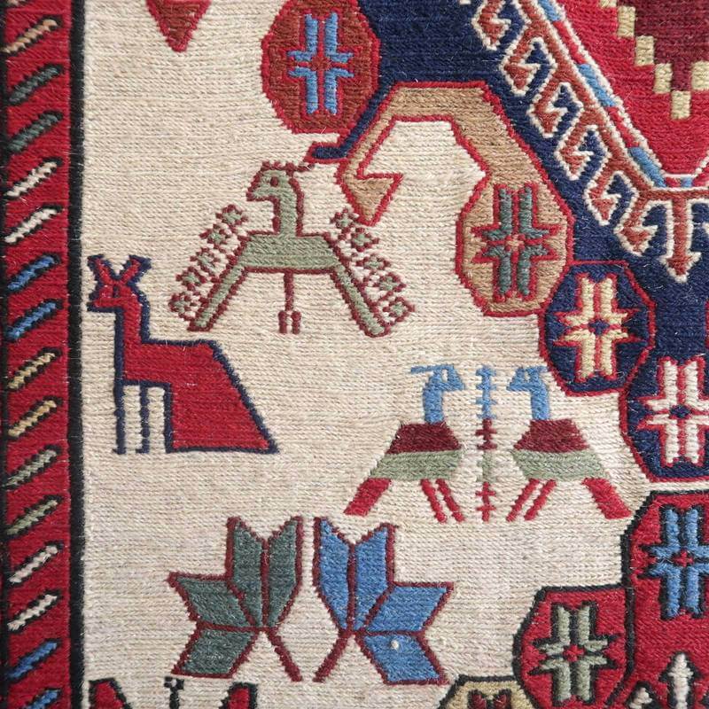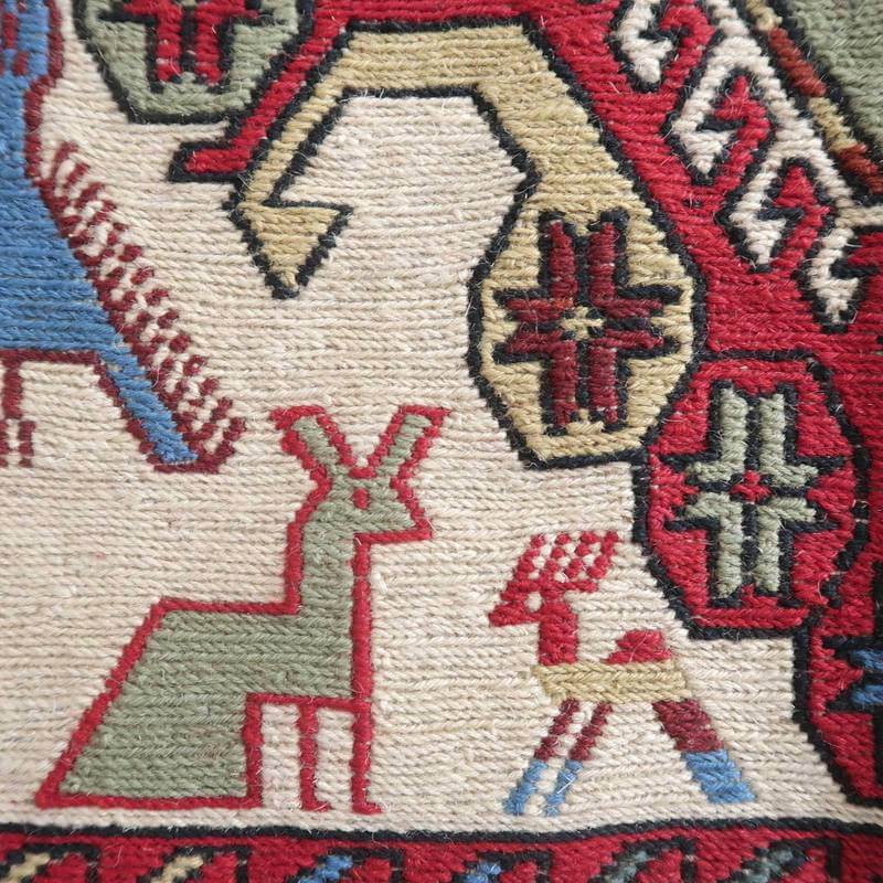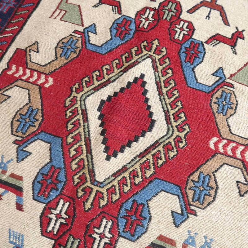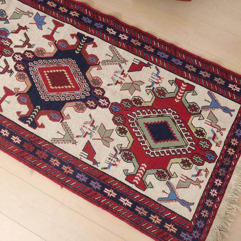 刺繍のように細かな文様が全面に施された美しいスマック織りのキリム。赤を基調に様々な色で文様が入った多色使いですが柄が細かいので落ち着きもあります。一目一目の模様をじっくり眺めて味わえるキリムでたいへん上質感があります。スマック織りは裏面に模様の糸を渡してあるので片面使いのキリムになります。スマック織りとは、イランのキリムの織り方の技法です。生地は刺繍のような仕上がりですが、これは後から刺したものではなく、土台の縦糸と横糸の上にもう一本横糸を絡めるように巻き込んで織っていく高度なテクニックで、生地を二重に織るため通常の平織りのキリムより倍の手間ひまが掛かる分高価になりますが、非常に堅固で丈夫、また普通より細かなデザインを描けるという長所がありますので、価格以上の価値を感じて頂けるキリムです。