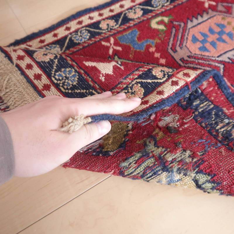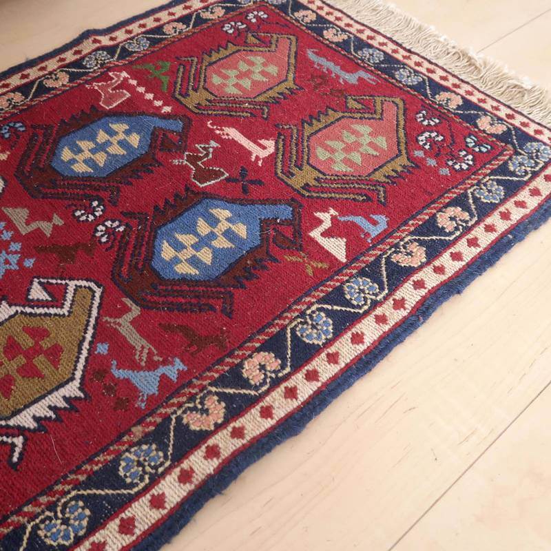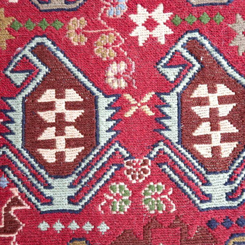 刺繍のように細かな文様が全面に施された美しいスマック織りのキリム。赤を基調に様々な色で文様が入った多色使いですが柄が細かいので落ち着きもあります。一目一目の模様をじっくり眺めて味わえるキリムでたいへん上質感があります。スマック織りは裏面に模様の糸を渡してあるので片面使いのキリムになります。スマック織りとは、イランのキリムの織り方の技法です。生地は刺繍のような仕上がりですが、これは後から刺したものではなく、土台の縦糸と横糸の上にもう一本横糸を絡めるように巻き込んで織っていく高度なテクニックで、生地を二重に織るため通常の平織りのキリムより倍の手間ひまが掛かる分高価になりますが、非常に堅固で丈夫、また普通より細かなデザインを描けるという長所がありますので、価格以上の価値を感じて頂けるキリムです。