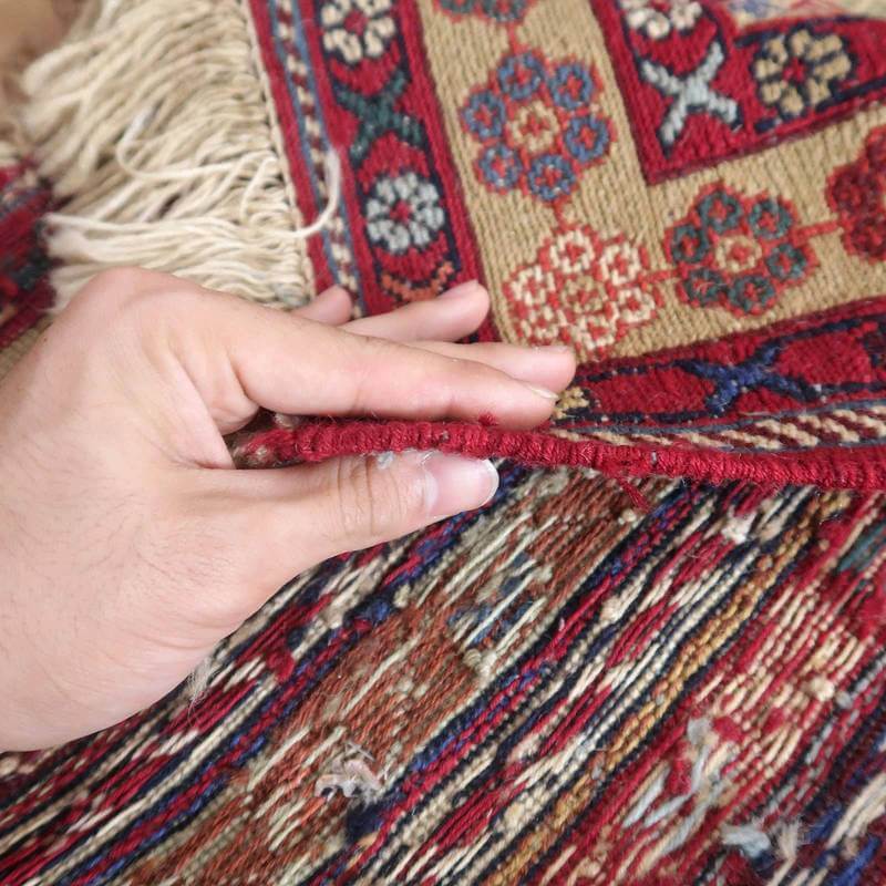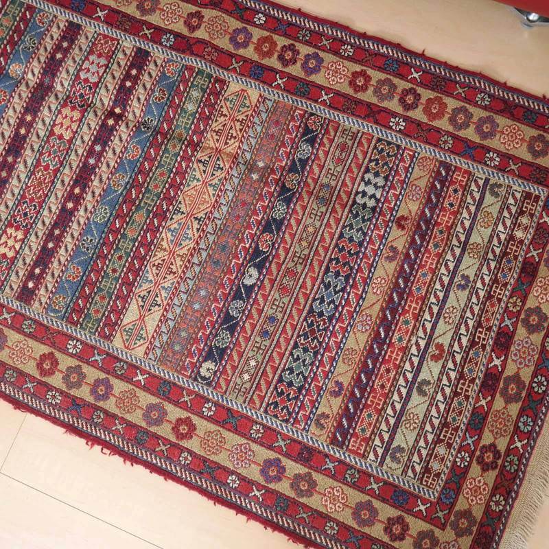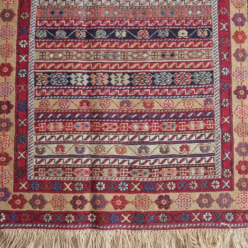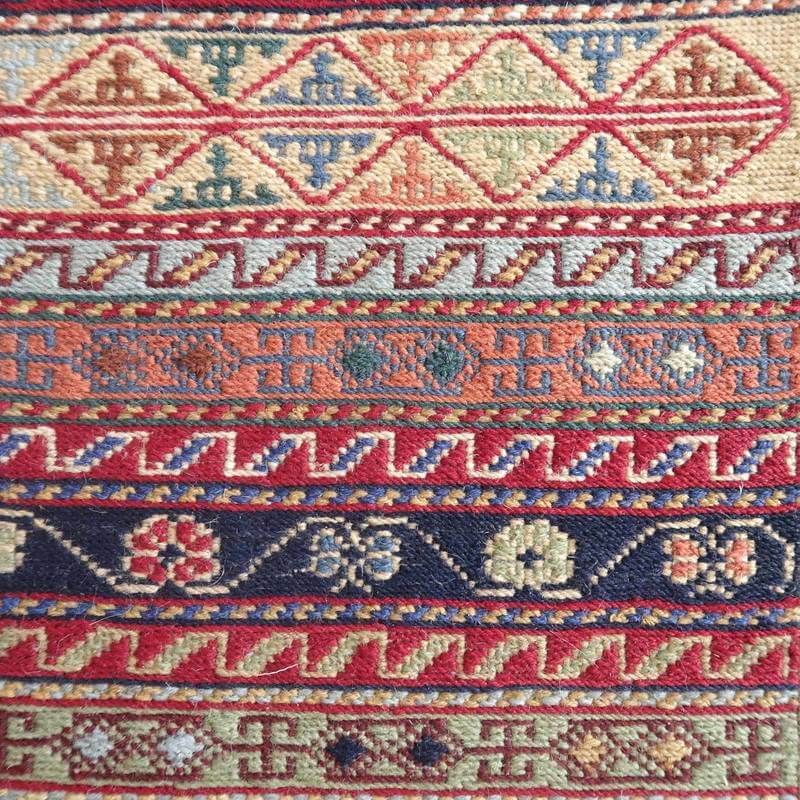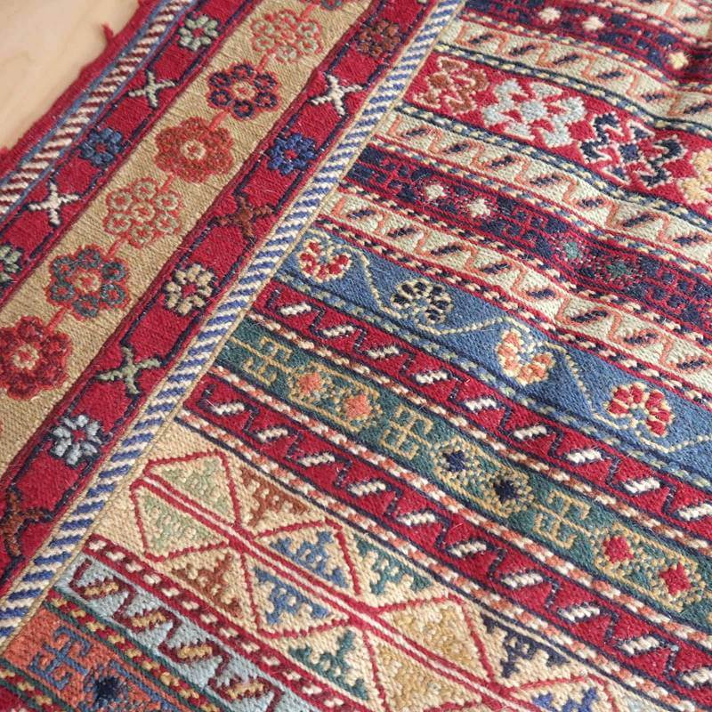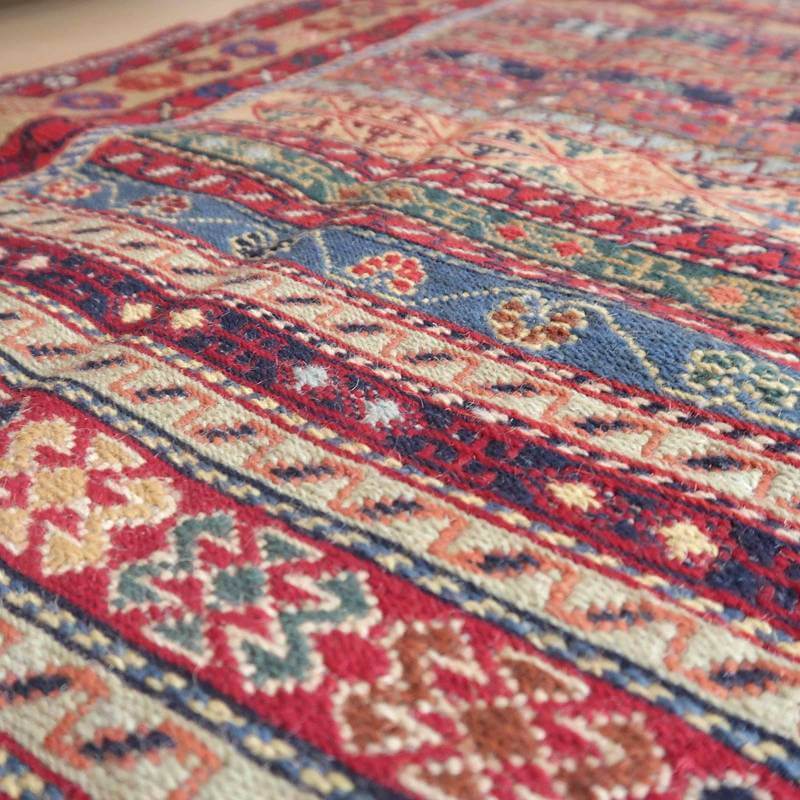 刺繍のように細かな文様が全面に施された美しいスマック織りのキリム。赤を基調に様々な色で文様が入った多色使いですが柄が細かいので落ち着きもあります。一目一目の模様をじっくり眺めて味わえるキリムでたいへん上質感があります。スマック織りは裏面に模様の糸を渡してあるので片面使いのキリムになります。スマック織りとは、イランのキリムの織り方の技法です。生地は刺繍のような仕上がりですが、これは後から刺したものではなく、土台の縦糸と横糸の上にもう一本横糸を絡めるように巻き込んで織っていく高度なテクニックで、生地を二重に織るため通常の平織りのキリムより倍の手間ひまが掛かる分高価になりますが、非常に堅固で丈夫、また普通より細かなデザインを描けるという長所がありますので、価格以上の価値を感じて頂けるキリムです。