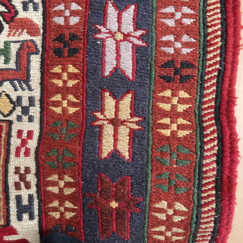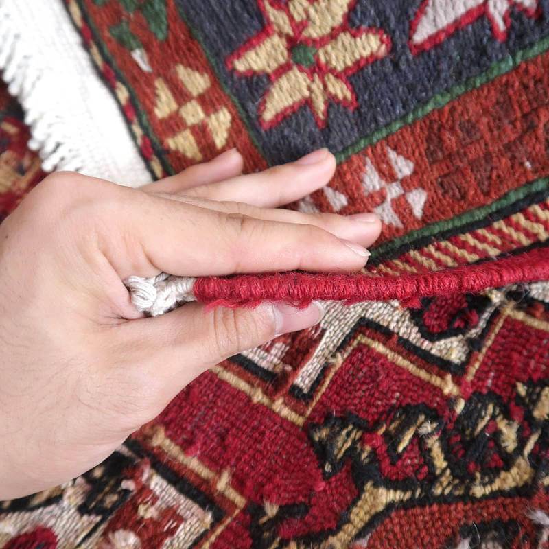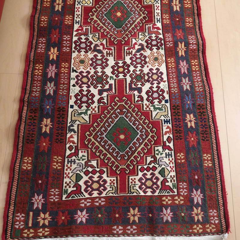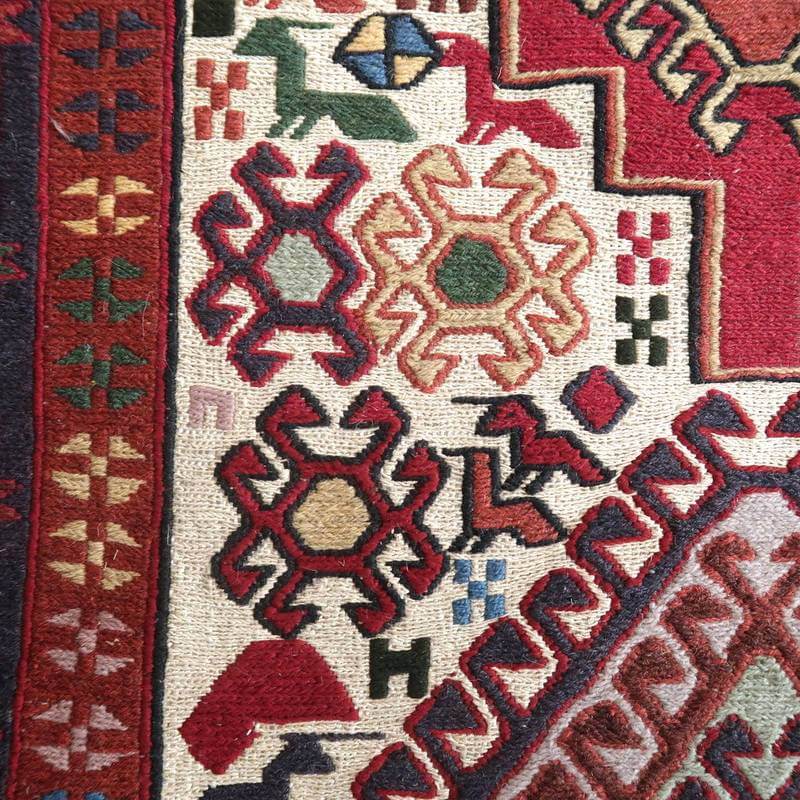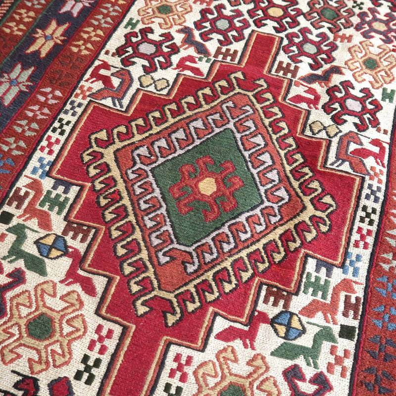 刺繍のように細かな文様が全面に施された美しいスマック織りのキリム。赤を基調に様々な色で文様が入った多色使いですが柄が細かいので落ち着きもあります。一目一目の模様をじっくり眺めて味わえるキリムでたいへん上質感があります。スマック織りは裏面に模様の糸を渡してあるので片面使いのキリムになります。スマック織りとは、イランのキリムの織り方の技法です。生地は刺繍のような仕上がりですが、これは後から刺したものではなく、土台の縦糸と横糸の上にもう一本横糸を絡めるように巻き込んで織っていく高度なテクニックで、生地を二重に織るため通常の平織りのキリムより倍の手間ひまが掛かる分高価になりますが、非常に堅固で丈夫、また普通より細かなデザインを描けるという長所がありますので、価格以上の価値を感じて頂けるキリムです。