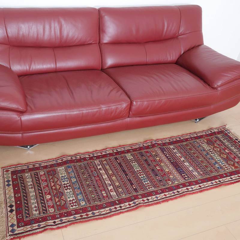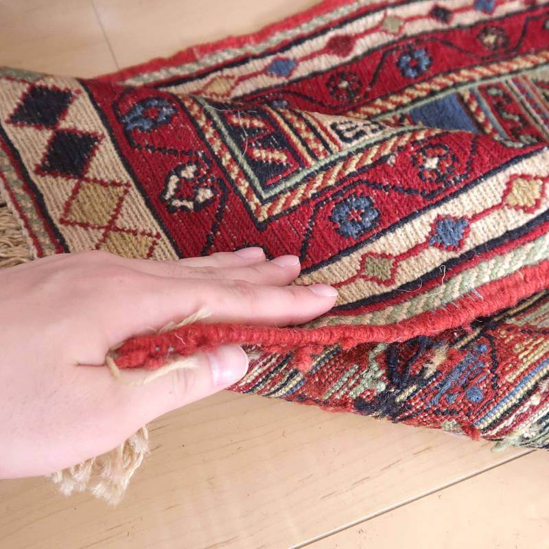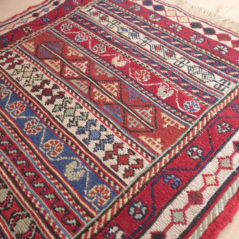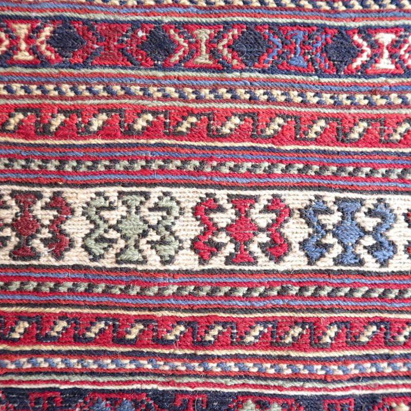 刺繍のように細かな文様が全面に施された美しいスマック織りのキリム。赤を基調に様々な色で文様が入った多色使いですが柄が細かいので落ち着きもあります。一目一目の模様をじっくり眺めて味わえるキリムでたいへん上質感があります。スマック織りは裏面に模様の糸を渡してあるので片面使いのキリムになります。スマック織りとは、イランのキリムの織り方の技法です。生地は刺繍のような仕上がりですが、これは後から刺したものではなく、土台の縦糸と横糸の上にもう一本横糸を絡めるように巻き込んで織っていく高度なテクニックで、生地を二重に織るため通常の平織りのキリムより倍の手間ひまが掛かる分高価になりますが、非常に堅固で丈夫、また普通より細かなデザインを描けるという長所がありますので、価格以上の価値を感じて頂けるキリムです。