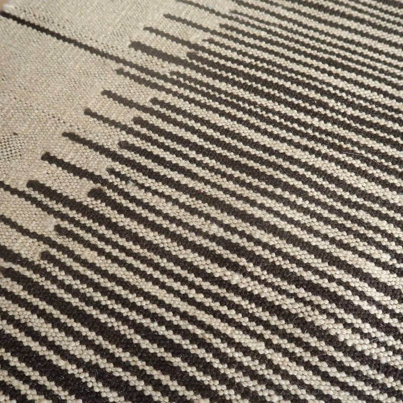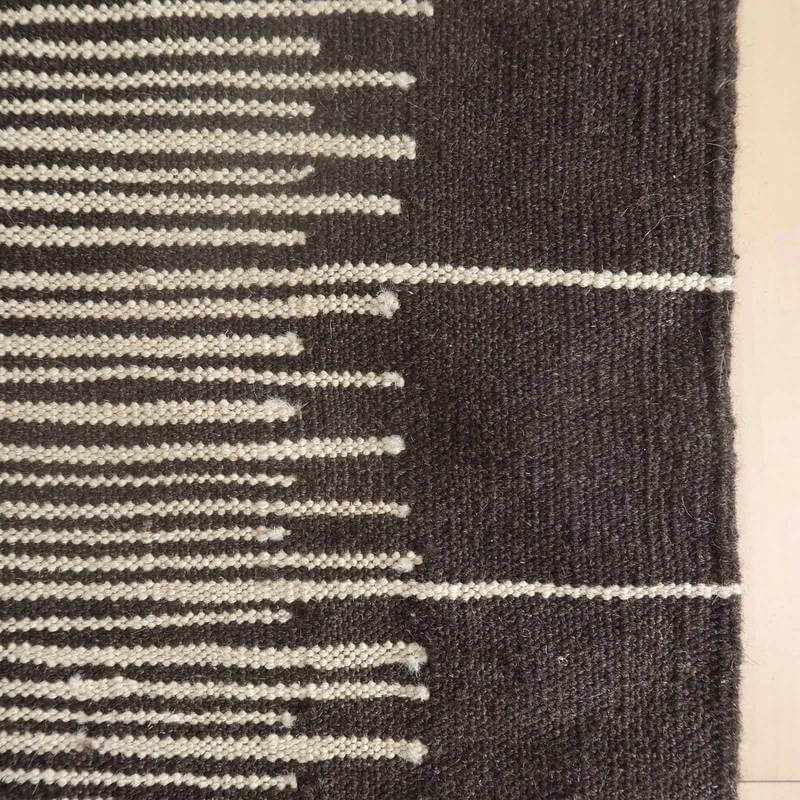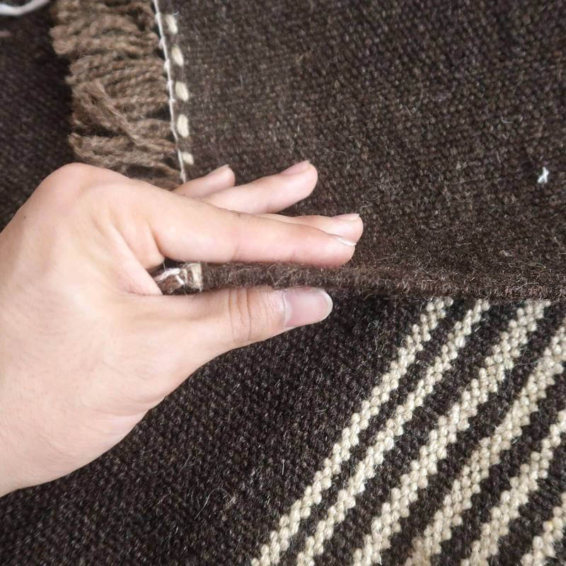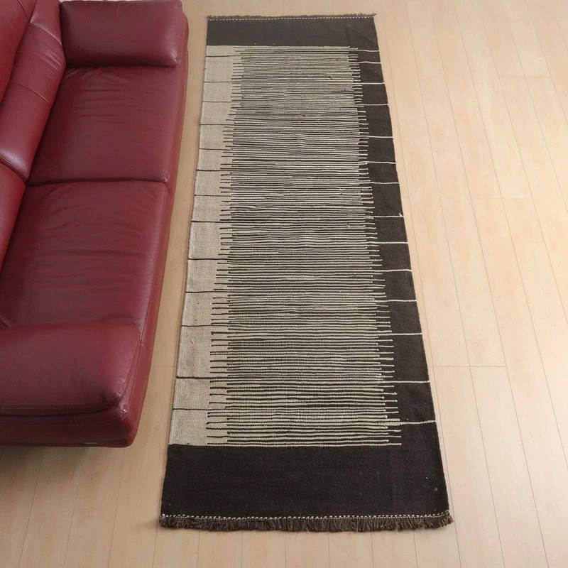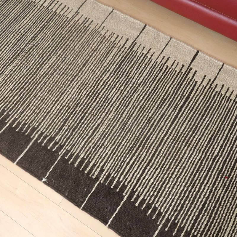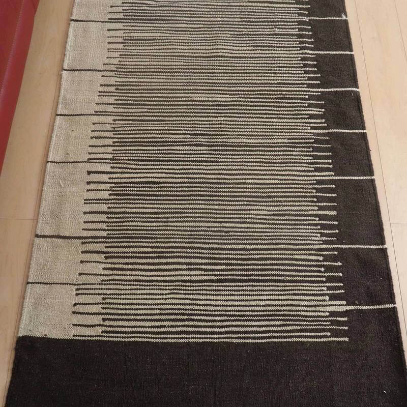 イラン南部シラーズ地方のキリムです。生成りや茶、グレーなどの元々の羊の毛色をそのまま活かした無染色のウールを使用したナチュラルカラーなので、敷く場所を選ばず、落ち着いた雰囲気で馴染みます。幾何学やギザギザ文様のシンプルな中にもリズムのあるモダンなデザイン。カシュガイの女性が昔ながらに織り上げたキリムなので、よく締まった丈夫な織り目で、早く仕上げる為、ゆるく粗く織られる商用生産のキリムには無い、誠実さと愛着が感じられる味わい深さがあります。作りは、平織り(ひらおり)という裏表の無い、両面を使える織り方。カシュガイ・キリムは遊牧のテント生活用の為、丈夫に織られ、洗濯も簡単、普段使いのラグとして扱いやすいキリムです。上端で103センチ、下端で100センチと横幅に手織りならではの違いがございます。