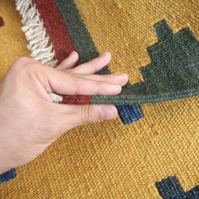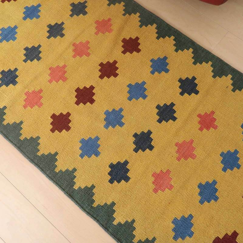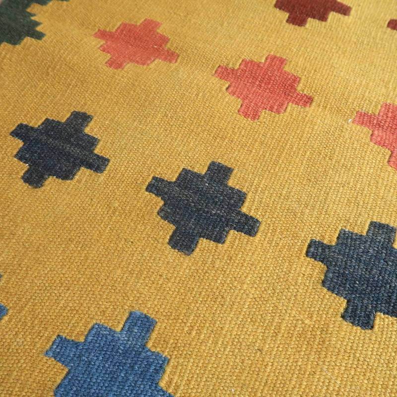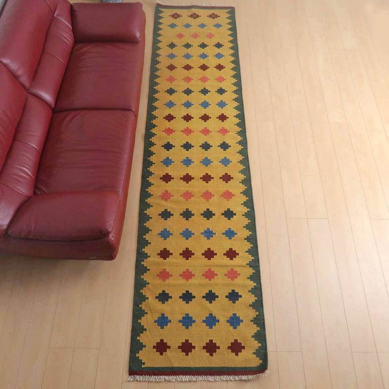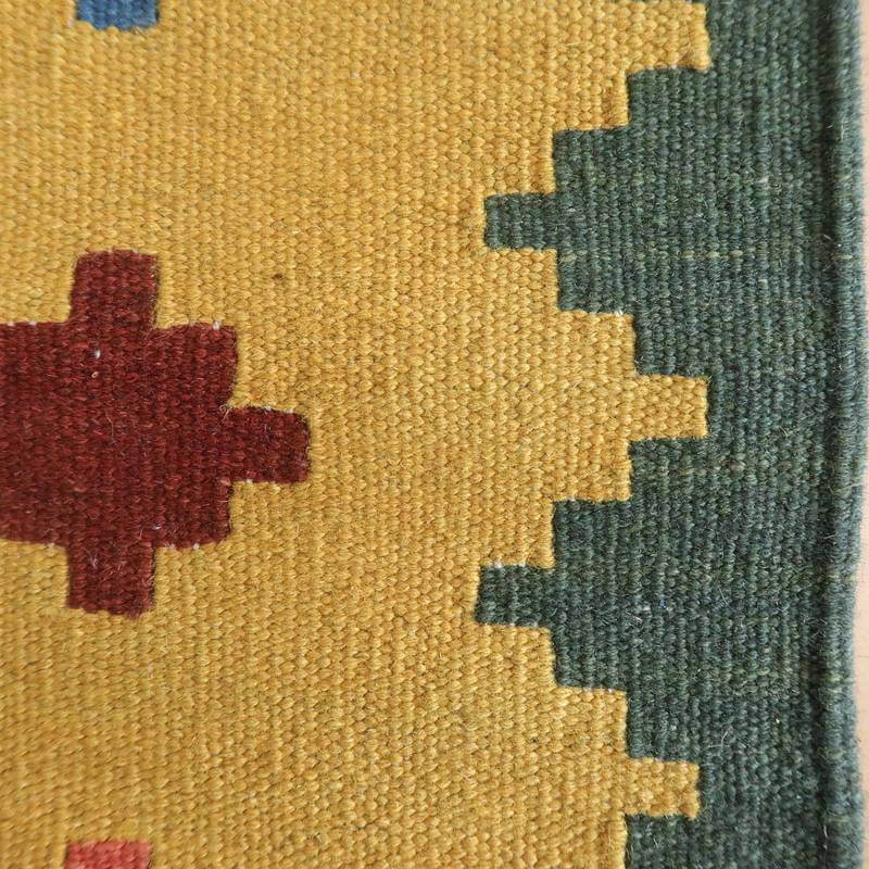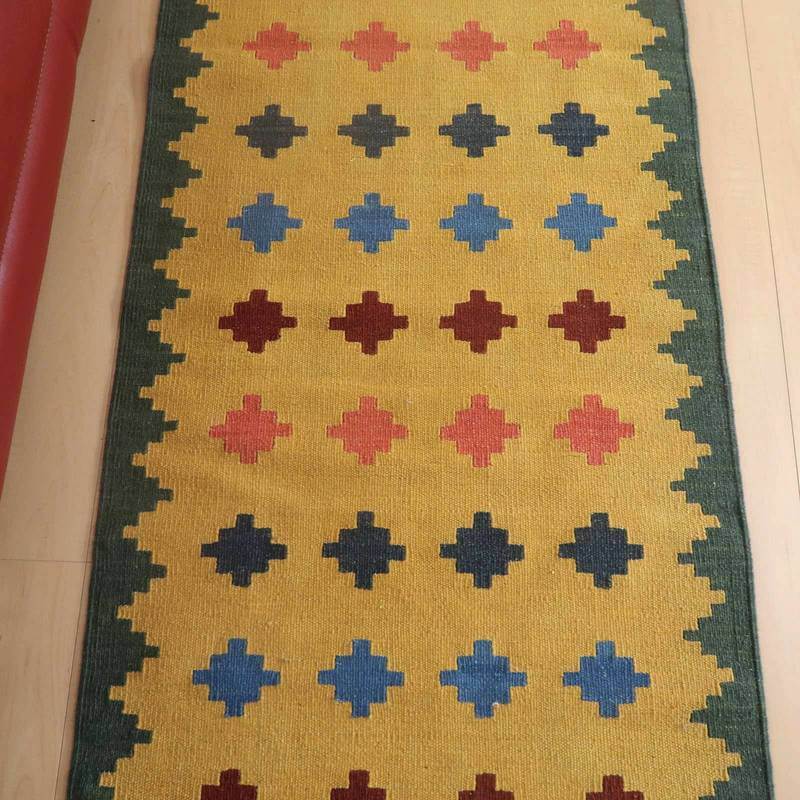 イラン南部シラーズ地方のキリムです。いくつかの色を使用した幾何学柄やギザギザ文様はリズムのある明るい雰囲気。使用している色はどれも、くすみのある落ち着いた色なので、目立たずインテリアに馴染みます。カシュガイの女性が昔ながらに織り上げたキリムなので、よく締まった丈夫な織り目で、早く仕上げる為、ゆるく粗く織られる商用生産のキリムには無い、誠実さが伝わってくる一枚です。また、平織り(ひらおり)という裏表の無い織り方で両面使えます。カシュガイ・キリムは遊牧のテント生活用の為、丈夫に織られ、洗濯も簡単、普段使いのラグとして扱いやすいキリムです。