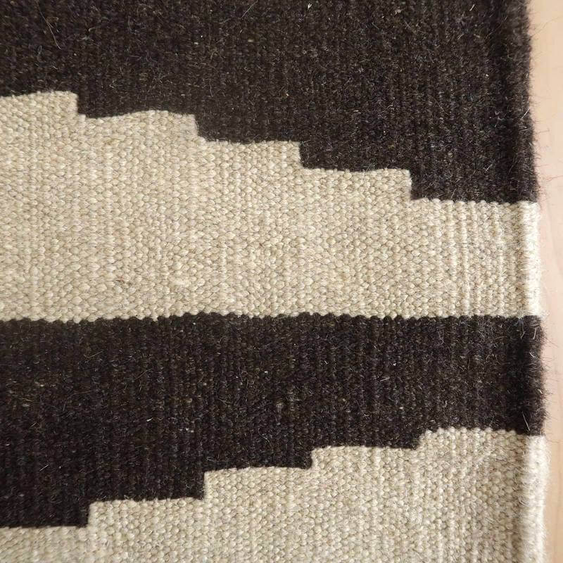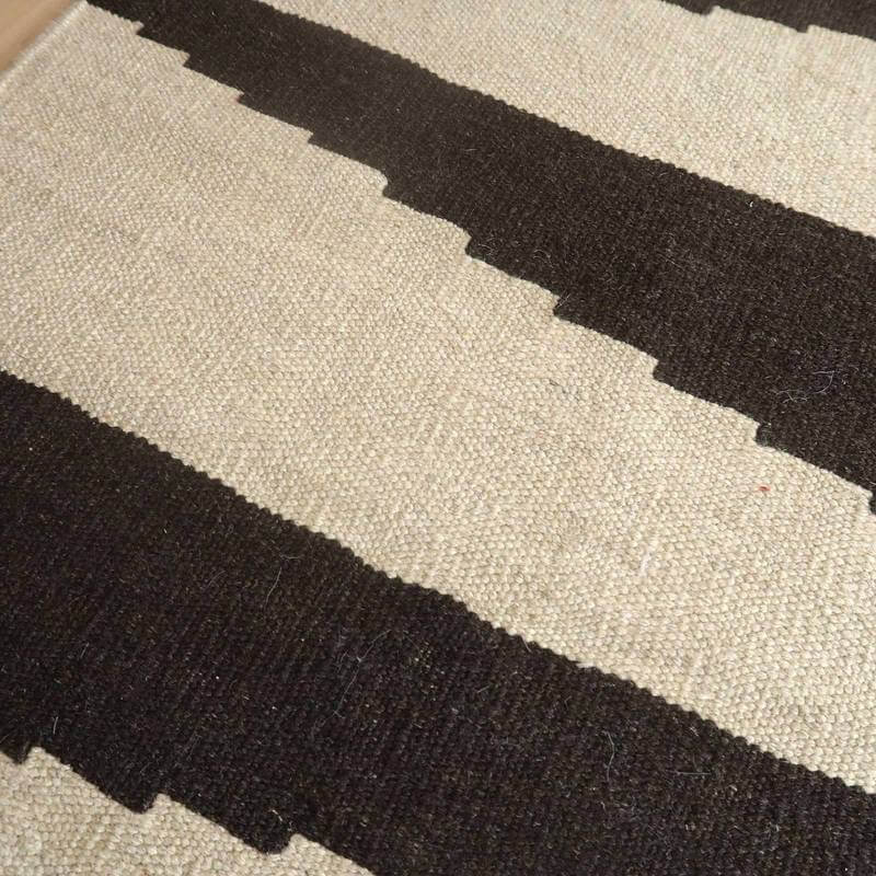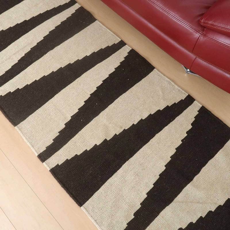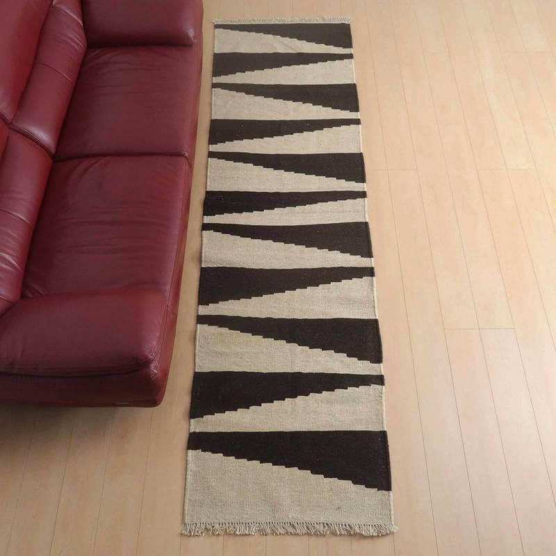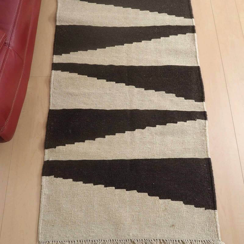 イラン南部シラーズ地方のキリムです。生成りや茶、グレーなどの元々の羊の毛色をそのまま活かした無染色のウールを使用したナチュラルカラーなので、敷く場所を選ばず、落ち着いた雰囲気で馴染みます。幾何学やギザギザ文様のシンプルな中にもリズムのあるモダンなデザイン。カシュガイの女性が昔ながらに織り上げたキリムなので、よく締まった丈夫な織り目で、早く仕上げる為、ゆるく粗く織られる商用生産のキリムには無い、誠実さと愛着が感じられる味わい深さがあります。作りは、平織り(ひらおり)という裏表の無い、両面を使える織り方。カシュガイ・キリムは遊牧のテント生活用の為、丈夫に織られ、洗濯も簡単、普段使いのラグとして扱いやすいキリムです。上端で77センチ、下端で82センチと横幅に手織りならではの違いがございます。