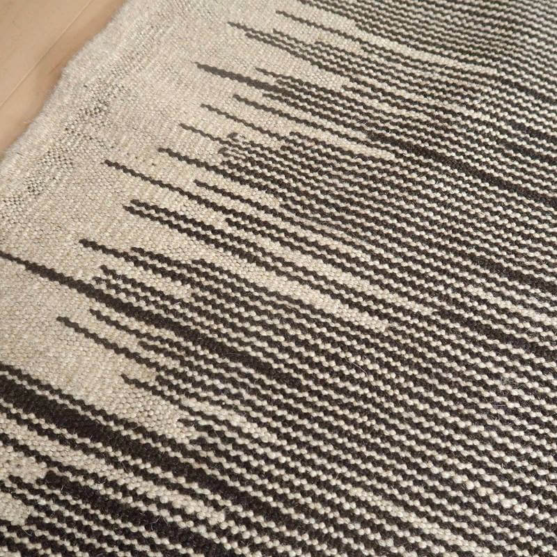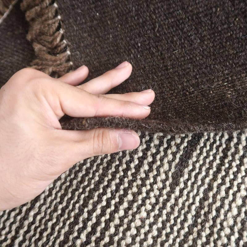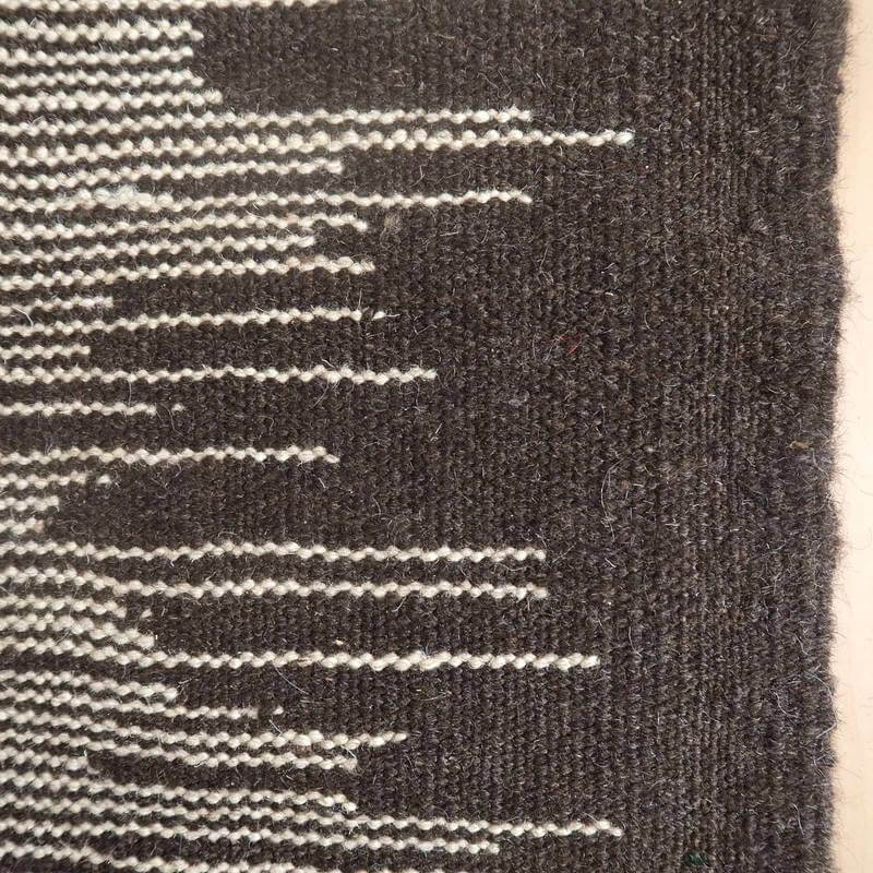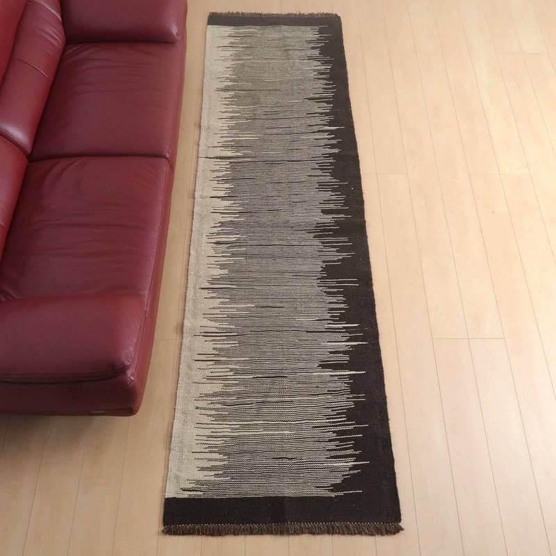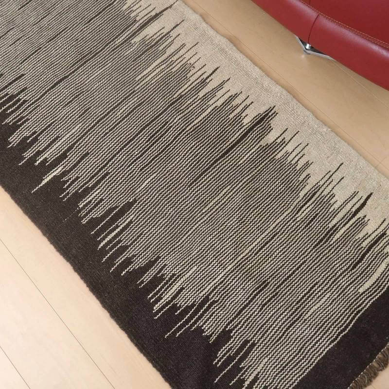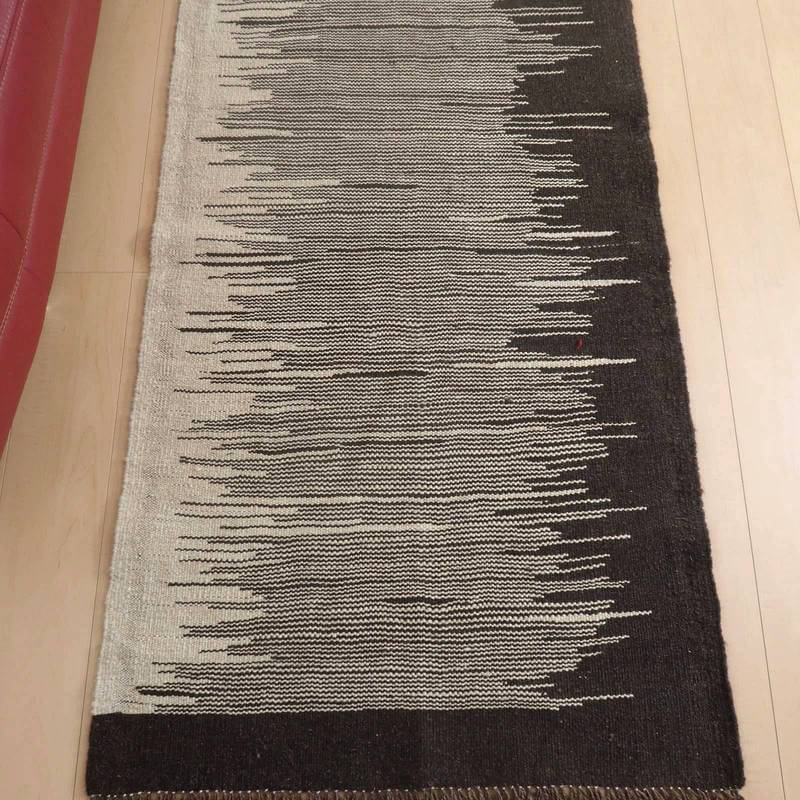 イラン南部シラーズ地方のキリムです。生成りや茶、グレーなどの元々の羊の毛色をそのまま活かした無染色のウールを使用したナチュラルカラーなので、敷く場所を選ばず、落ち着いた雰囲気で馴染みます。幾何学やギザギザ文様のシンプルな中にもリズムのあるモダンなデザイン。カシュガイの女性が昔ながらに織り上げたキリムなので、よく締まった丈夫な織り目で、早く仕上げる為、ゆるく粗く織られる商用生産のキリムには無い、誠実さと愛着が感じられる味わい深さがあります。作りは、平織り(ひらおり)という裏表の無い、両面を使える織り方。カシュガイ・キリムは遊牧のテント生活用の為、丈夫に織られ、洗濯も簡単、普段使いのラグとして扱いやすいキリムです。上端で83センチ、下端で78センチと横幅に手織りならではの違いがございます。