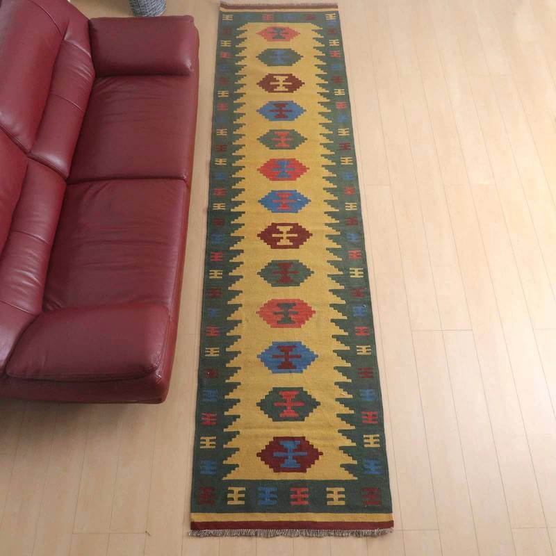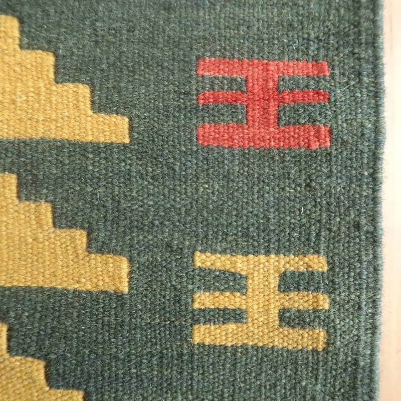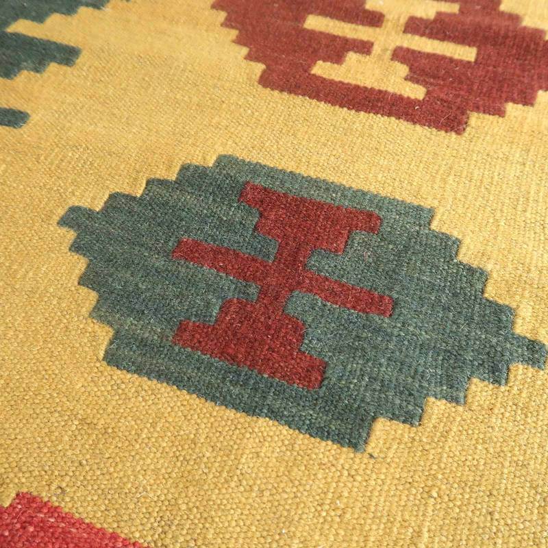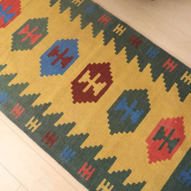 イラン南部シラーズ地方のキリムです。いくつかの色を使用した幾何学柄やギザギザ文様はリズムのある明るい雰囲気。使用している色はどれも、くすみのある落ち着いた色なので、目立たずインテリアに馴染みます。カシュガイの女性が昔ながらに織り上げたキリムなので、よく締まった丈夫な織り目で、早く仕上げる為、ゆるく粗く織られる商用生産のキリムには無い、誠実さが伝わってくる一枚です。また、平織り(ひらおり)という裏表の無い織り方で両面使えます。カシュガイ・キリムは遊牧のテント生活用の為、丈夫に織られ、洗濯も簡単、普段使いのラグとして扱いやすいキリムです。