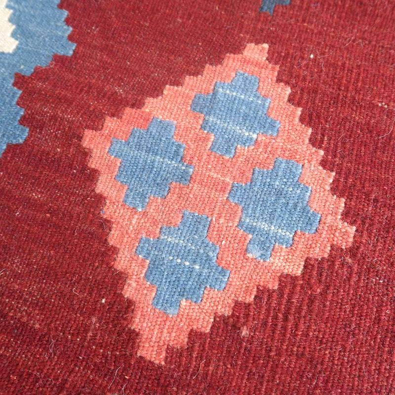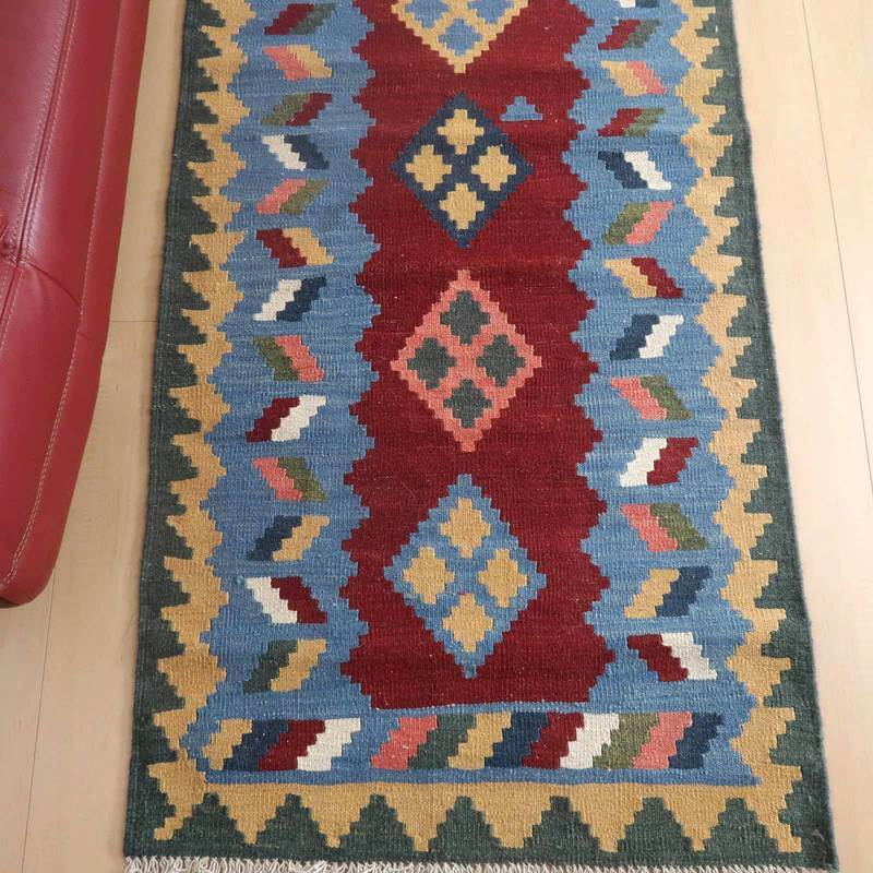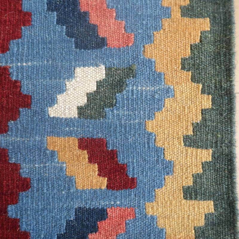 イラン南部シラーズ地方のキリムです。いくつかの色を使用した幾何学柄やギザギザ文様はリズムのある明るい雰囲気。使用している色はどれも、くすみのある落ち着いた色なので、目立たずインテリアに馴染みます。カシュガイの女性が昔ながらに織り上げたキリムなので、よく締まった丈夫な織り目で、早く仕上げる為、ゆるく粗く織られる商用生産のキリムには無い、誠実さが伝わってくる一枚です。また、平織り(ひらおり)という裏表の無い織り方で両面使えます。カシュガイ・キリムは遊牧のテント生活用の為、丈夫に織られ、洗濯も簡単、普段使いのラグとして扱いやすいキリムです。形に手織りならではカーブが少し感じられます。