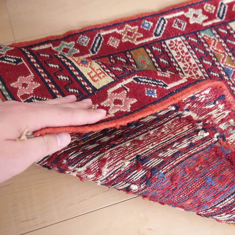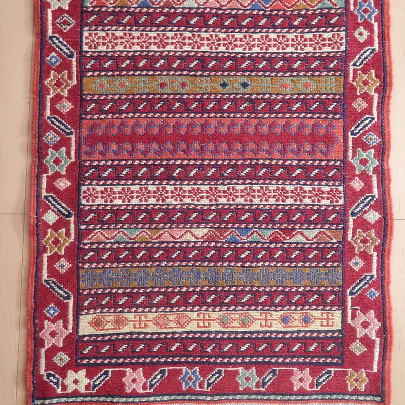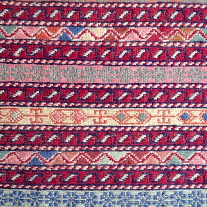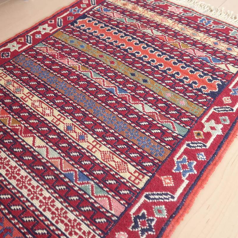 刺繍のように細かな文様が全面に施された美しいスマック織りのキリム。赤を基調に様々な色で文様が入った多色使いですが柄が細かいので落ち着きもあります。一目一目の模様をじっくり眺めて味わえるキリムでたいへん上質感があります。スマック織りは裏面に模様の糸を渡してあるので片面使いのキリムになります。スマック織りとは、イランのキリムの織り方の技法です。生地は刺繍のような仕上がりですが、これは後から刺したものではなく、土台の縦糸と横糸の上にもう一本横糸を絡めるように巻き込んで織っていく高度なテクニックで、生地を二重に織るため通常の平織りのキリムより倍の手間ひまが掛かる分高価になりますが、非常に堅固で丈夫、また普通より細かなデザインを描けるという長所がありますので、価格以上の価値を感じて頂けるキリムです。