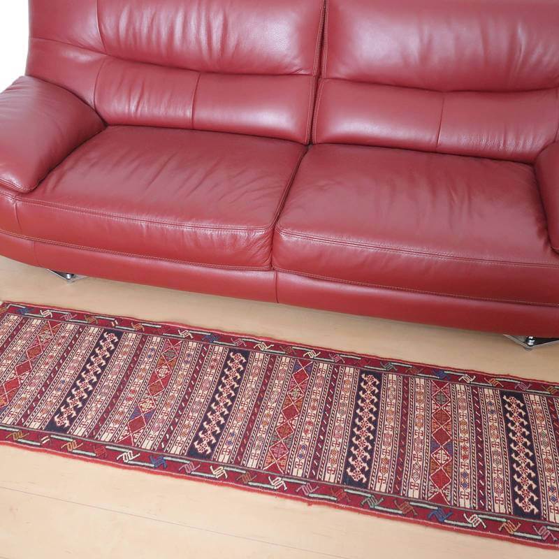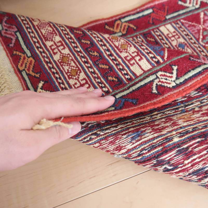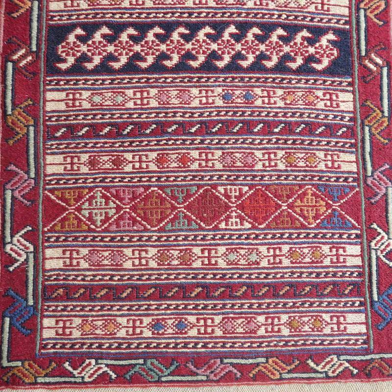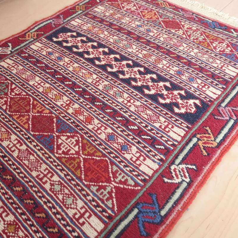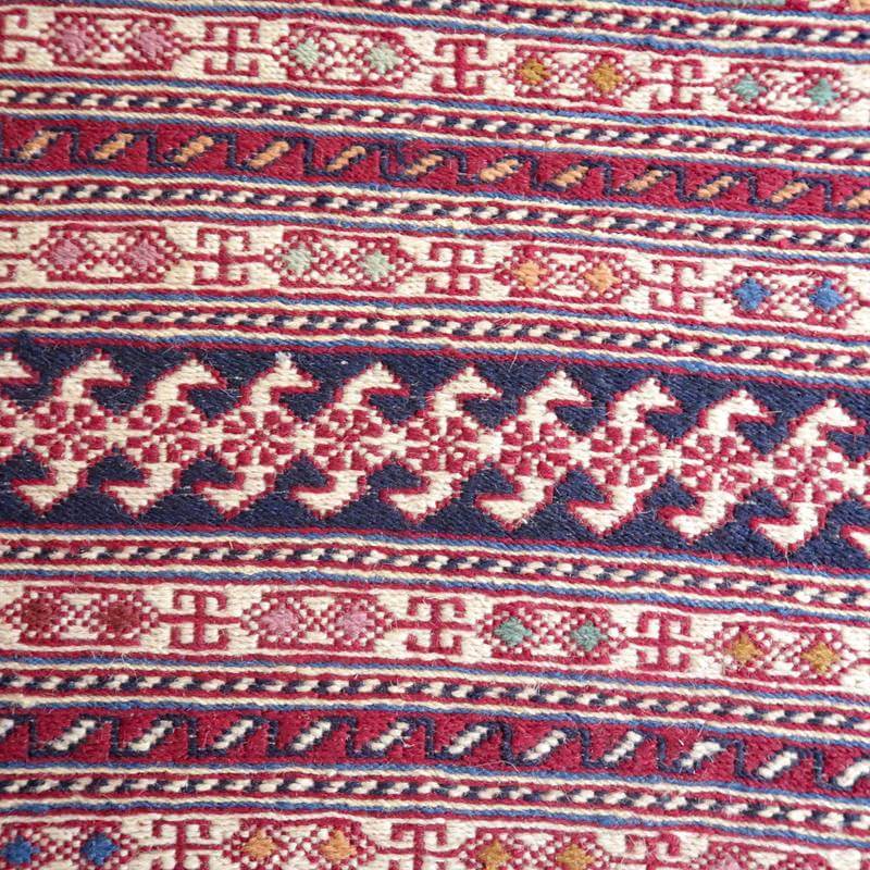 刺繍のように細かな文様が全面に施された美しいスマック織りのキリム。赤を基調に様々な色で文様が入った多色使いですが柄が細かいので落ち着きもあります。一目一目の模様をじっくり眺めて味わえるキリムでたいへん上質感があります。スマック織りは裏面に模様の糸を渡してあるので片面使いのキリムになります。スマック織りとは、イランのキリムの織り方の技法です。生地は刺繍のような仕上がりですが、これは後から刺したものではなく、土台の縦糸と横糸の上にもう一本横糸を絡めるように巻き込んで織っていく高度なテクニックで、生地を二重に織るため通常の平織りのキリムより倍の手間ひまが掛かる分高価になりますが、非常に堅固で丈夫、また普通より細かなデザインを描けるという長所がありますので、価格以上の価値を感じて頂けるキリムです。