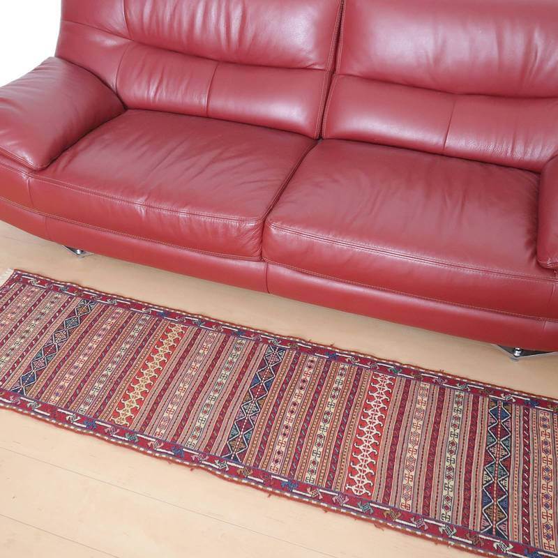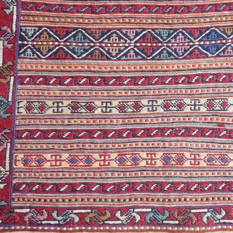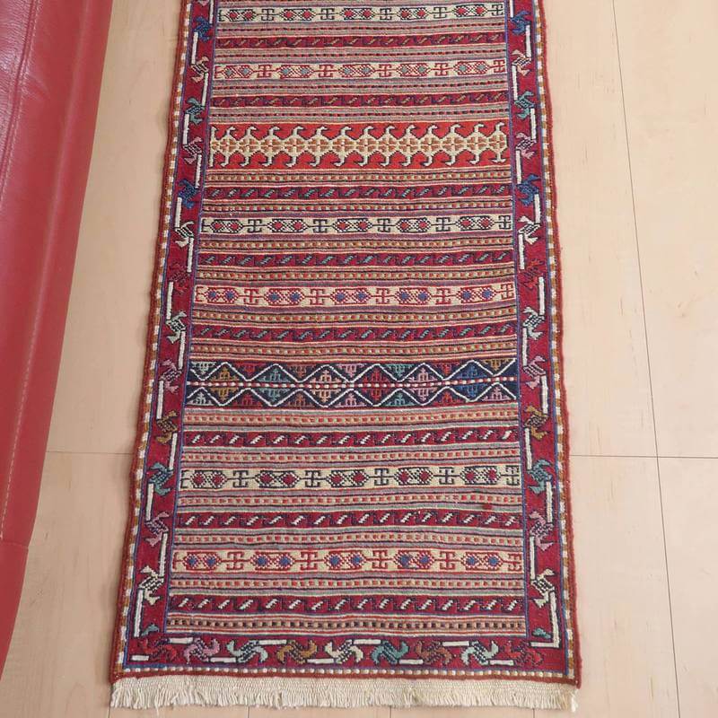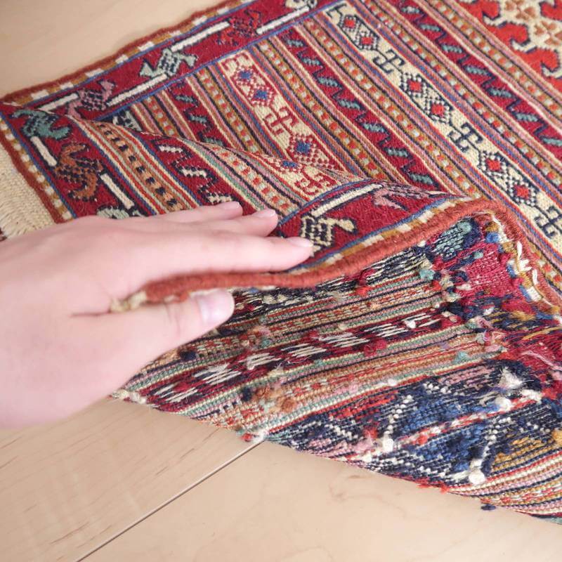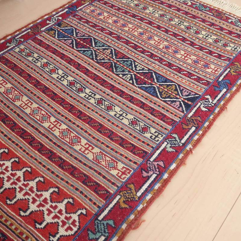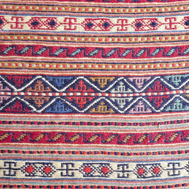 刺繍のように細かな文様が全面に施された美しいスマック織りのキリム。赤を基調に様々な色で文様が入った多色使いですが柄が細かいので落ち着きもあります。一目一目の模様をじっくり眺めて味わえるキリムでたいへん上質感があります。スマック織りは裏面に模様の糸を渡してあるので片面使いのキリムになります。スマック織りとは、イランのキリムの織り方の技法です。生地は刺繍のような仕上がりですが、これは後から刺したものではなく、土台の縦糸と横糸の上にもう一本横糸を絡めるように巻き込んで織っていく高度なテクニックで、生地を二重に織るため通常の平織りのキリムより倍の手間ひまが掛かる分高価になりますが、非常に堅固で丈夫、また普通より細かなデザインを描けるという長所がありますので、価格以上の価値を感じて頂けるキリムです。