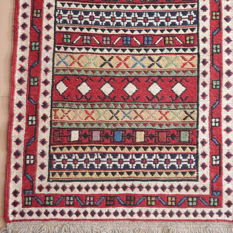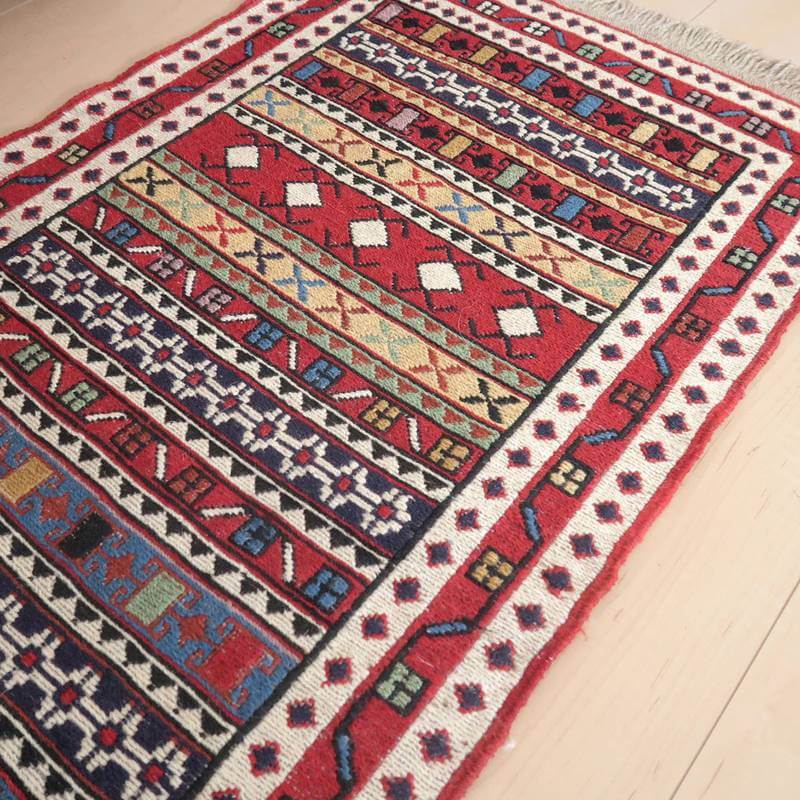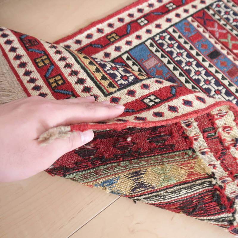 刺繍のように細かな文様が全面に施された美しいスマック織りのキリム。赤を基調に様々な色で文様が入った多色使いですが柄が細かいので落ち着きもあります。一目一目の模様をじっくり眺めて味わえるキリムでたいへん上質感があります。スマック織りは裏面に模様の糸を渡してあるので片面使いのキリムになります。スマック織りとは、イランのキリムの織り方の技法です。生地は刺繍のような仕上がりですが、これは後から刺したものではなく、土台の縦糸と横糸の上にもう一本横糸を絡めるように巻き込んで織っていく高度なテクニックで、生地を二重に織るため通常の平織りのキリムより倍の手間ひまが掛かる分高価になりますが、非常に堅固で丈夫、また普通より細かなデザインを描けるという長所がありますので、価格以上の価値を感じて頂けるキリムです。