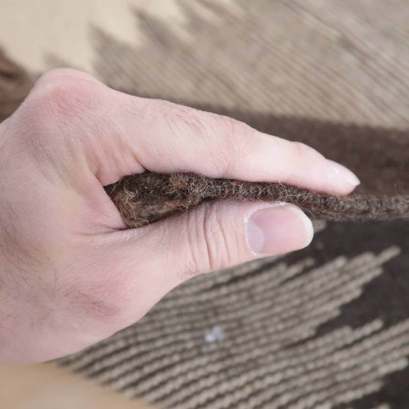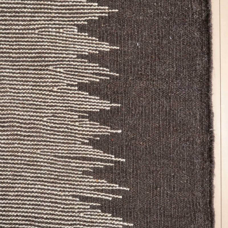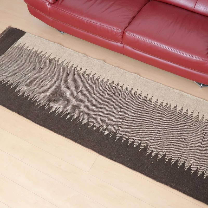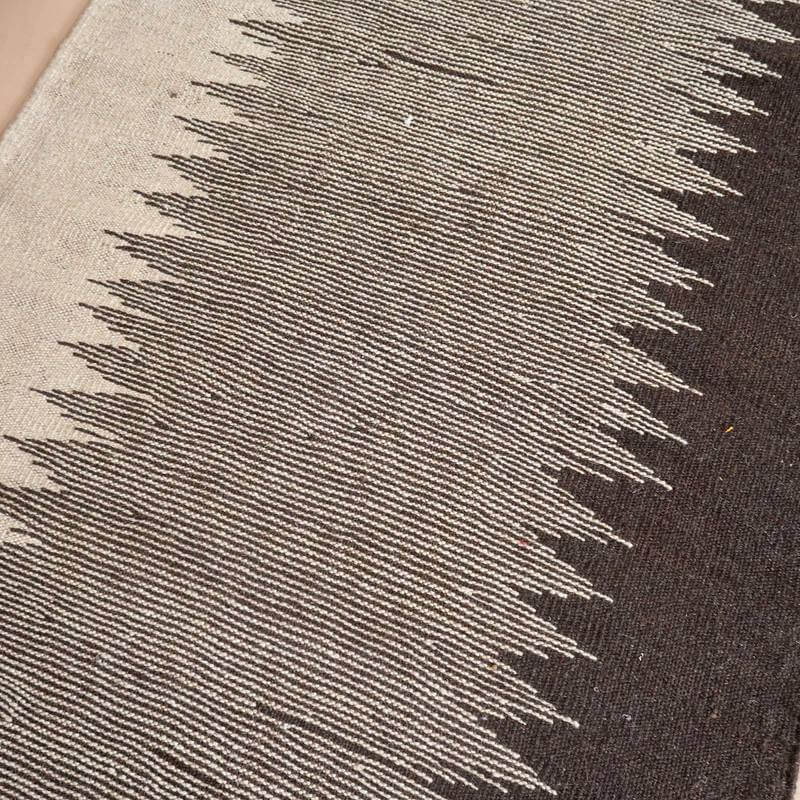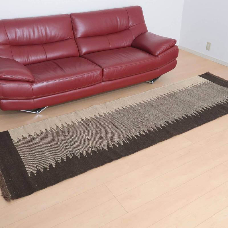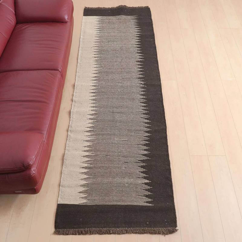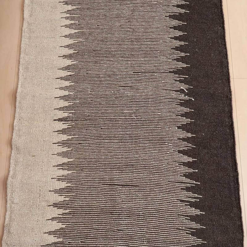 イラン南部シラーズ地方のキリムです。生成りや茶、グレーなどの元々の羊の毛色をそのまま活かした無染色のウールを使用したナチュラルカラーなので、敷く場所を選ばず、落ち着いた雰囲気で馴染みます。幾何学やギザギザ文様のシンプルな中にもリズムのあるモダンなデザイン。カシュガイの女性が昔ながらに織り上げたキリムなので、よく締まった丈夫な織り目で、早く仕上げる為、ゆるく粗く織られる商用生産のキリムには無い、誠実さと愛着が感じられる味わい深さがあります。作りは、平織り(ひらおり)という裏表の無い、両面を使える織り方。カシュガイ・キリムは遊牧のテント生活用の為、丈夫に織られ、洗濯も簡単、普段使いのラグとして扱いやすいキリムです。