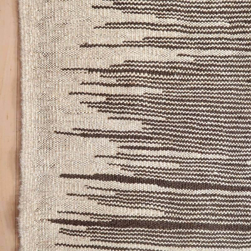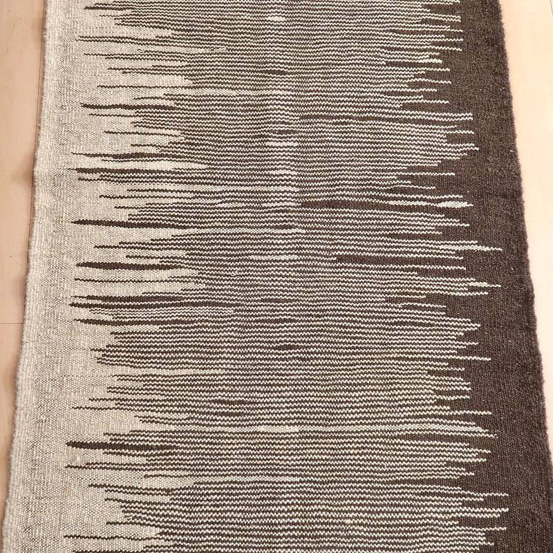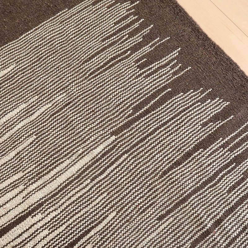 イラン南部シラーズ地方のキリムです。生成りや茶、グレーなどの元々の羊の毛色をそのまま活かした無染色のウールを使用したナチュラルカラーなので、敷く場所を選ばず、落ち着いた雰囲気で馴染みます。幾何学やギザギザ文様のシンプルな中にもリズムのあるモダンなデザイン。カシュガイの女性が昔ながらに織り上げたキリムなので、よく締まった丈夫な織り目で、早く仕上げる為、ゆるく粗く織られる商用生産のキリムには無い、誠実さと愛着が感じられる味わい深さがあります。作りは、平織り(ひらおり)という裏表の無い、両面を使える織り方。カシュガイ・キリムは遊牧のテント生活用の為、丈夫に織られ、洗濯も簡単、普段使いのラグとして扱いやすいキリムです。