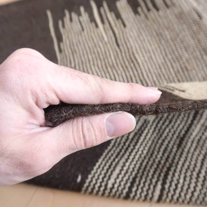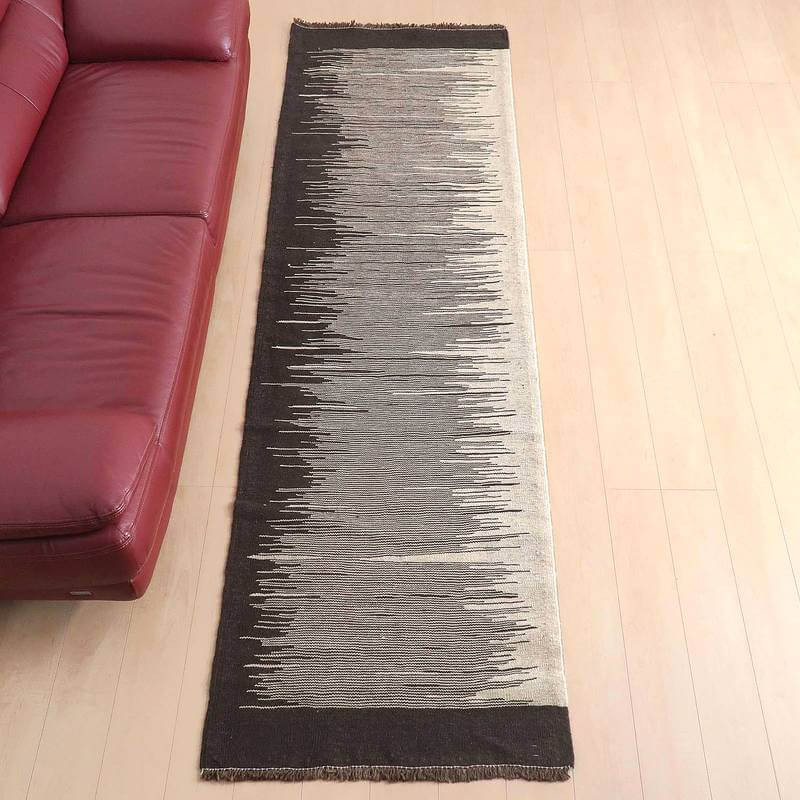 イラン南部シラーズ地方のキリムです。生成りや茶、グレーなどの元々の羊の毛色をそのまま活かした無染色のウールを使用したナチュラルカラーなので、敷く場所を選ばず、落ち着いた雰囲気で馴染みます。幾何学やギザギザ文様のシンプルな中にもリズムのあるモダンなデザイン。カシュガイの女性が昔ながらに織り上げたキリムなので、よく締まった丈夫な織り目で、早く仕上げる為、ゆるく粗く織られる商用生産のキリムには無い、誠実さと愛着が感じられる味わい深さがあります。作りは、平織り(ひらおり)という裏表の無い、両面を使える織り方。カシュガイ・キリムは遊牧のテント生活用の為、丈夫に織られ、洗濯も簡単、普段使いのラグとして扱いやすいキリムです。