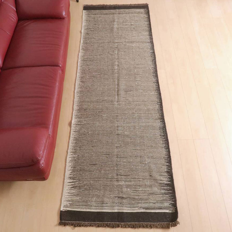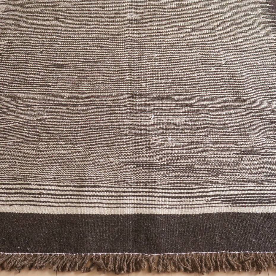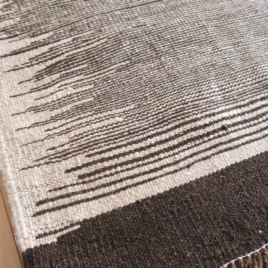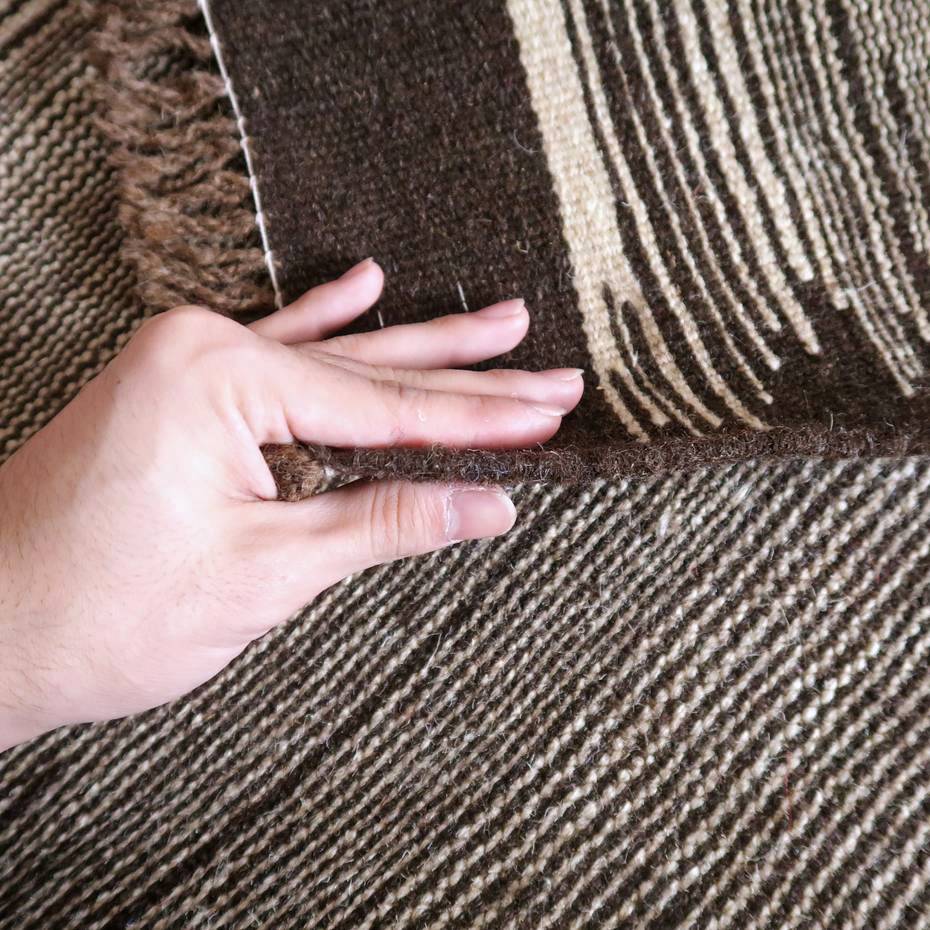ギャッベでお馴染みのシラーズ地方カシュガイ族に伝わるキリムです。生成りや茶、グレーなどの元々の羊の毛色をそのまま活かした無染色のウールを使用したナチュラルカラーなので、敷く場所を選ばず、落ち着いた雰囲気で馴染みます。幾何学やギザギザ文様のシンプルな中にもリズムのあるモダンなデザイン。カシュガイの女性が昔ながらに織り上げたキリムなので、よく締まった丈夫な織り目で、早く仕上げる為、ゆるく粗く織られる商用生産のキリムには無い、誠実さと愛着が感じられる味わい深さがあります。作りは、平織り(ひらおり)という裏表の無い、両面を使える織り方。カシュガイ・キリムは遊牧のテント生活用の為、丈夫に織られ、洗濯も簡単、普段使いのラグとして扱いやすいキリムです。