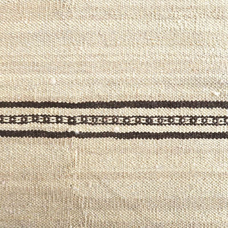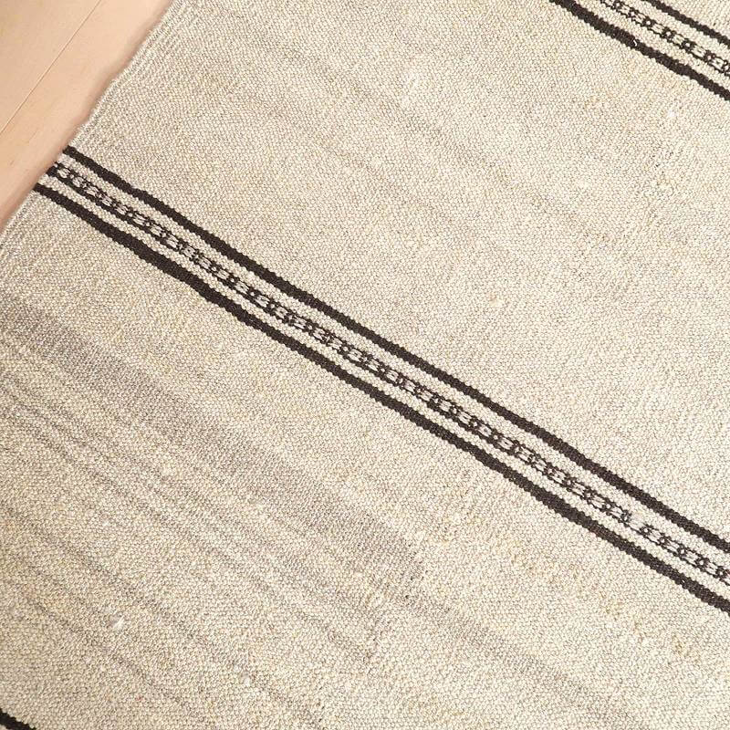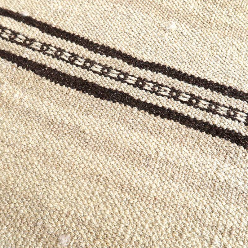 イラン南部シラーズ地方のキリムです。生成りや茶、グレーなどの元々の羊の毛色をそのまま活かした無染色のウールを使用したナチュラルカラーなので、敷く場所を選ばず、落ち着いた雰囲気で馴染みます。幾何学やギザギザ文様のシンプルな中にもリズムのあるモダンなデザイン。カシュガイの女性が昔ながらに織り上げたキリムなので、よく締まった丈夫な織り目で、早く仕上げる為、ゆるく粗く織られる商用生産のキリムには無い、誠実さと愛着が感じられる味わい深さがあります。作りは、平織り(ひらおり)という裏表の無い、両面を使える織り方。カシュガイ・キリムは遊牧のテント生活用の為、丈夫に織られ、洗濯も簡単、普段使いのラグとして扱いやすいキリムです。