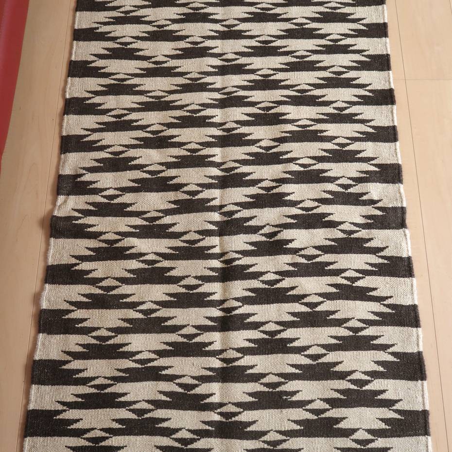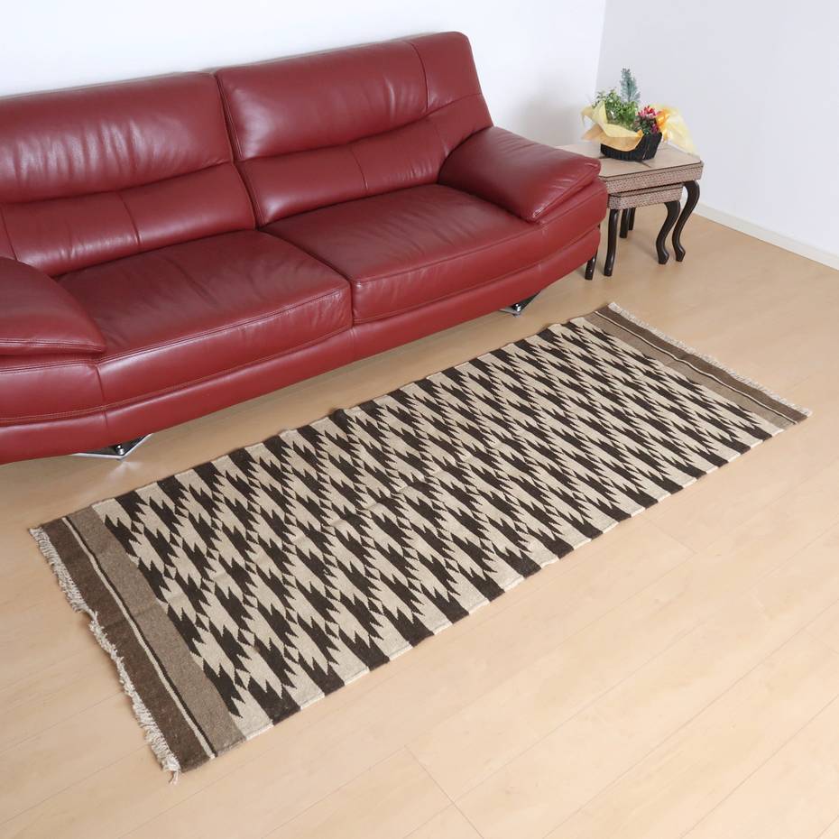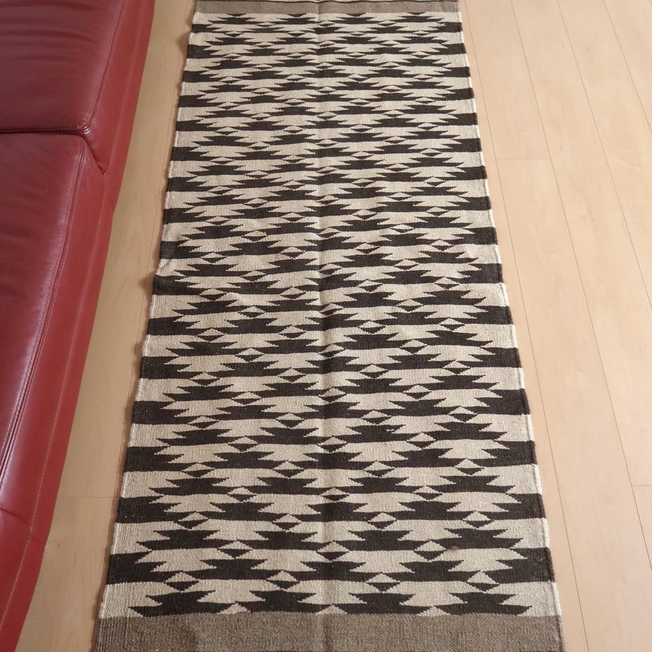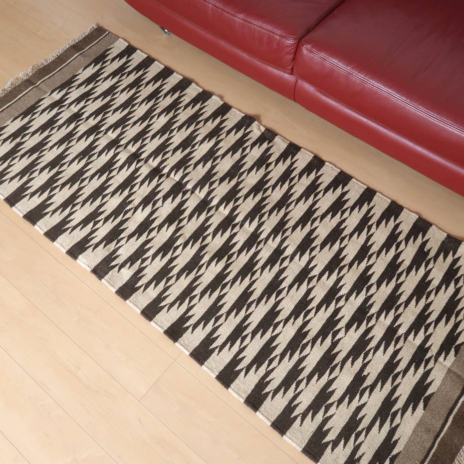 ギャッベでお馴染みのシラーズ地方カシュガイ族に伝わるキリムです。生成りや茶、グレーなどの元々の羊の毛色をそのまま活かした無染色のウールを使用したナチュラルカラーなので、敷く場所を選ばず、落ち着いた雰囲気で馴染みます。幾何学やギザギザ文様のシンプルな中にもリズムのあるモダンなデザイン。カシュガイの女性が昔ながらに織り上げたキリムなので、よく締まった丈夫な織り目で、早く仕上げる為、ゆるく粗く織られる商用生産のキリムには無い、誠実さと愛着が感じられる味わい深さがあります。作りは、平織り(ひらおり)という裏表の無い、両面を使える織り方。カシュガイ・キリムは遊牧のテント生活用の為、丈夫に織られ、洗濯も簡単、普段使いのラグとして扱いやすいキリムです。